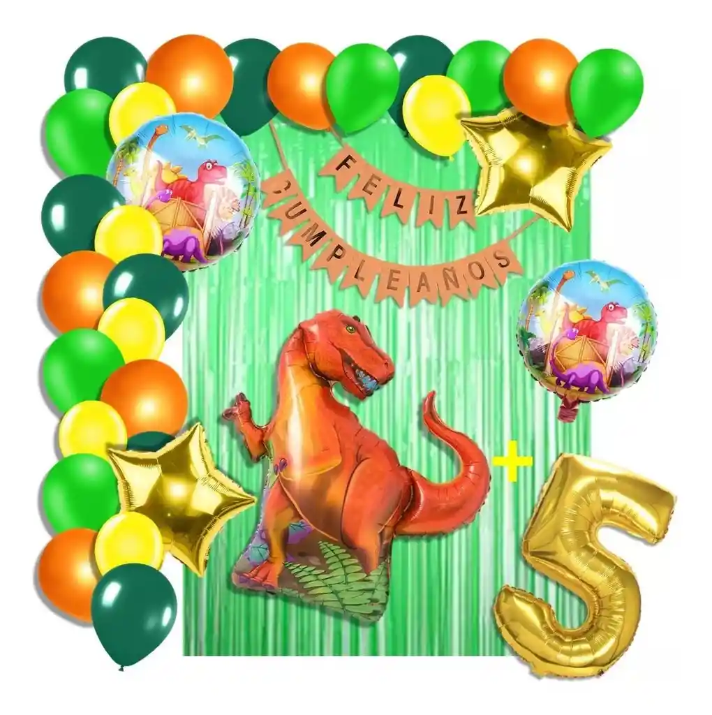 *********************GLOBOS Y PELUCHES MASMELO********************* Por tu compra te llevas. 2 Cortina verde 1×2 metros 100 Globos surtidos: amarillo, naranja, verde selva, verde estándar 30cm y 13cm R12 y R6 colores iguales a la foto suficientes para un arco orgánico de globos de 5 metros 2 Globo circular temática dinosaurio 45x45cm 1 Globo dinosaurio 70×45 cm 2 Globo estrella dorado 45x45cm 1 Globo número dorado segun tu elección 82 cm de altura 1 guirnalda feston feliz cumpleaños 2 metros de largo 7 metros de nylon para amarrar globos 1 Cinta de 100 Puntos Adhesivos *Los globos se entregan desinflados, tu compra no incluye el montaje ni la decoración, el servicio de armado no lo tenemos disponible. sin embargo te damos todas las instrucciones para hacer de modo profesional. Si deseas adicionar otros articulos a tu compra puedes escribirnos, recuerda que Somos Globos y Peluches Masmelo Si necesitas variación en los colores, colocar un número, más globos o realizar otros cambios en el diseño original escribenos para ver si podemos hacerlo. Tenemos todo lo necesario para tus decoraciones, somos lo último en tendencias mundiales decorativas. Tenemos disponible: Vasos, platos, manteles, guirnaldas, cubiertos, globos de todo tipo, números, letreros, vela, Etc. Puedes encontrar los articulos de nuestra tienda en el siguiente link, copia y pega, si no encuentas lo que necesitas escribenos: https://www.rappi.com.co/tiendas/900280040-globosypeluchesmasmelo-mt-enc/decoracion-para-fiestas/globos-y-bombas