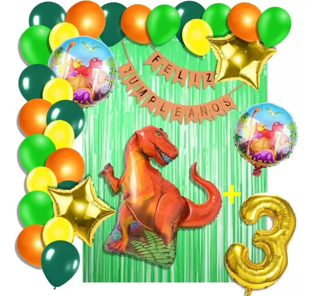 *********************GLOBOS Y PELUCHES MASMELO********************* Por tu compra te llevas. 2 Cortina verde 1×2 metros 100 Globos surtidos: amarillo, naranja, verde selva, verde estándar 30cm y 13cm R12 y R6 colores iguales a la foto suficientes para un arco orgánico de globos de 5 metros 2 Globo circular temática dinosaurio 45x45cm 1 Globo dinosaurio 70×45 cm 2 Globo estrella dorado 45x45cm 1 Globo número dorado segun tu elección 82 cm de altura 1 guirnalda feston feliz cumpleaños 2 metros de largo 7 metros de nylon para amarrar globos 1 Cinta de 100 Puntos Adhesivos *Los globos se entregan desinflados, tu compra no incluye el montaje ni la decoración, el servicio de armado no lo tenemos disponible. sin embargo te damos todas las instrucciones para hacer de modo profesional. Si deseas adicionar otros articulos a tu compra puedes escribirnos, recuerda que Somos Globos y Peluches Masmelo Si necesitas variación en los colores, colocar un número, más globos o realizar otros cambios en el diseño original escribenos para ver si podemos hacerlo. Tenemos todo lo necesario para tus decoraciones, somos lo último en tendencias mundiales decorativas. Tenemos disponible: Vasos, platos, manteles, guirnaldas, cubiertos, globos de todo tipo, números, letreros, vela, Etc. Puedes encontrar los articulos de nuestra tienda en el siguiente link, copia y pega, si no encuentas lo que necesitas escribenos: https://www.rappi.com.co/tiendas/900280040-globosypeluchesmasmelo-mt-enc/decoracion-para-fiestas/globos-y-bombas
