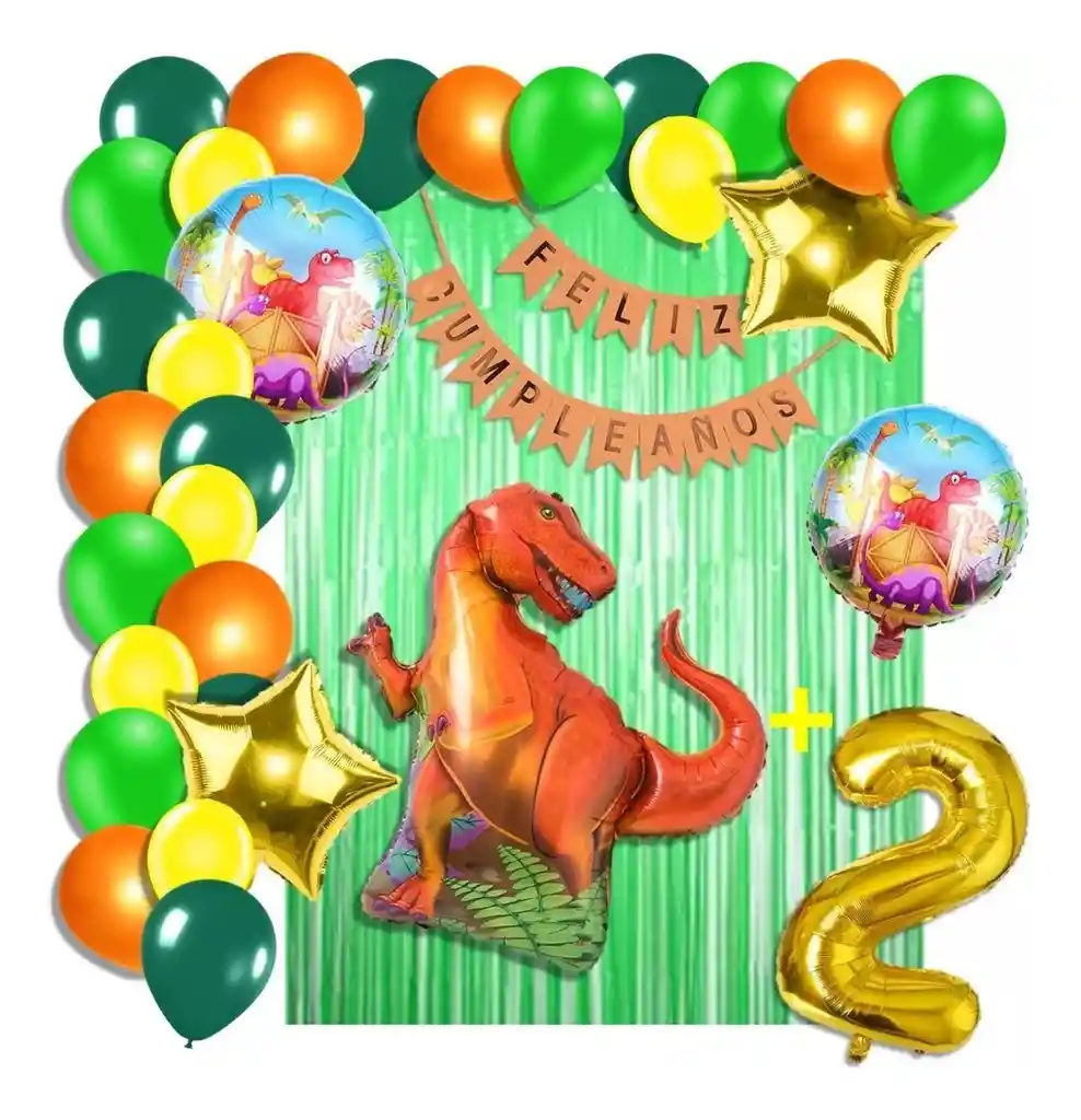 *********************GLOBOS Y PELUCHES MASMELO********************* Por tu compra te llevas. 2 Cortina verde 1×2 metros 100 Globos surtidos: amarillo, naranja, verde selva, verde estándar 30cm y 13cm R12 y R6 colores iguales a la foto suficientes para un arco orgánico de globos de 5 metros 2 Globo circular temática dinosaurio 45x45cm 1 Globo dinosaurio 70×45 cm 2 Globo estrella dorado 45x45cm 1 Globo número dorado segun tu elección 82 cm de altura 1 guirnalda feston feliz cumpleaños 2 metros de largo 7 metros de nylon para amarrar globos 1 Cinta de 100 Puntos Adhesivos *Los globos se entregan desinflados, tu compra no incluye el montaje ni la decoración, el servicio de armado no lo tenemos disponible. sin embargo te damos todas las instrucciones para hacer de modo profesional. Si deseas adicionar otros articulos a tu compra puedes escribirnos, recuerda que Somos Globos y Peluches Masmelo Si necesitas variación en los colores, colocar un número, más globos o realizar otros cambios en el diseño original escribenos para ver si podemos hacerlo. Tenemos todo lo necesario para tus decoraciones, somos lo último en tendencias mundiales decorativas. Tenemos disponible: Vasos, platos, manteles, guirnaldas, cubiertos, globos de todo tipo, números, letreros, vela, Etc. Puedes encontrar los articulos de nuestra tienda en el siguiente link, copia y pega, si no encuentas lo que necesitas escribenos: https://www.rappi.com.co/tiendas/900280040-globosypeluchesmasmelo-mt-enc/decoracion-para-fiestas/globos-y-bombas