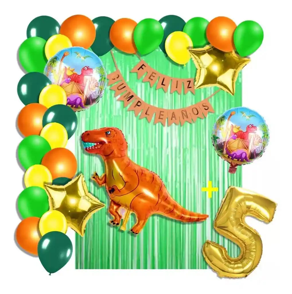 *********************GLOBOS Y PELUCHES MASMELO********************* Por tu compra te llevas. 2 Cortina verde 1×2 metros 100 Globos surtidos: amarillo, naranja, verde selva, verde estándar 30cm y 13cm R12 y R6 colores iguales a la foto suficientes para un arco orgánico de globos de 5 metros 2 Globo circular temática dinosaurio 45x45cm 1 Globo dinosaurio 70×45 cm 2 Globo estrella dorado 45x45cm 1 Globo número dorado segun tu elección 82 cm de altura 1 guirnalda feston feliz cumpleaños 2 metros de largo 7 metros de nylon para amarrar globos 1 Cinta de 100 Puntos Adhesivos *Los globos se entregan desinflados, tu compra no incluye el montaje ni la decoración, el servicio de armado no lo tenemos disponible. sin embargo te damos todas las instrucciones para hacer de modo profesional. Si deseas adicionar otros articulos a tu compra puedes escribirnos, recuerda que Somos Globos y Peluches Masmelo Si necesitas variación en los colores, colocar un número, más globos o realizar otros cambios en el diseño original escribenos para ver si podemos hacerlo. Tenemos todo lo necesario para tus decoraciones, somos lo último en tendencias mundiales decorativas. Tenemos disponible: Vasos, platos, manteles, guirnaldas, cubiertos, globos de todo tipo, números, letreros, vela, Etc. Puedes encontrar los articulos de nuestra tienda en el siguiente link, copia y pega, si no encuentas lo que necesitas escribenos: https://www.rappi.com.co/tiendas/900280040-globosypeluchesmasmelo-mt-enc/decoracion-para-fiestas/globos-y-bombas