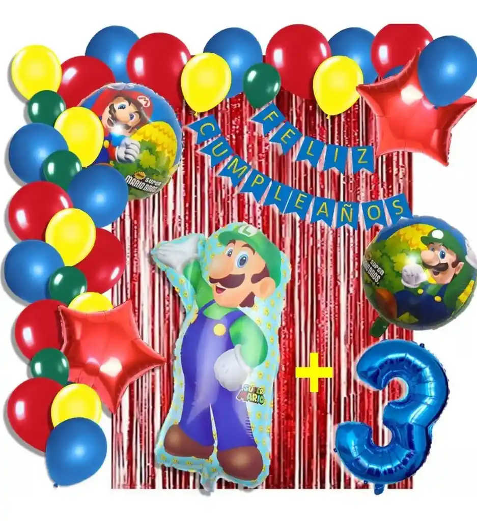*********************GLOBOS Y PELUCHES MASMELO********************* --------------------------Somos Mercado Lider Platinum------------------------ Por tu compra te llevas. 2 Cortina rojo 1x2 metros 100 Globos surtidos: amarillo rojo azul, verde 30cm y 13cm R12 y R6 colores iguales a la foto suficientes para un arco orgánico de globos de 5 metros 2 Globo circular temática Mario Bros 45x45cm 1 Globo Luigi 70x45 cm 2 Globo estrella Rojo 45x45cm 1 Globo número azul segun tu elección 82 cm de altura 1 guirnalda feston feliz cumpleaños 2 metros de largo 7 metros de nylon para amarrar globos 1 Cinta de 100 Puntos Adhesivos *Los globos se entregan desinflados, tu compra no incluye el montaje ni la decoración, el servicio de armado no lo tenemos disponible. sin embargo te damos todas las instrucciones para hacer de modo profesional. Si deseas adicionar otros articulos a tu compra puedes escribirnos, recuerda que Somos Globos y Peluches Masmelo ;) Si necesitas variación en los colores, colocar un número, más globos o realizar otros cambios en el diseño original escribenos para ver si podemos hacerlo. Tenemos todo lo necesario para tus decoraciones, somos lo último en tendencias mundiales decorativas. Tenemos disponible: Vasos, platos, manteles, guirnaldas, cubiertos, globos de todo tipo, números, letreros, vela, Etc. Puedes encontrar los articulos de nuestra tienda en el siguiente link, copia y pega, si no encuentas lo que necesitas escribenos: https://www.rappi.com.co/tiendas/900280040-globosypeluchesmasmelo-mt-enc/decoracion-para-fiestas/globos-y-bombas - En ciudades fuera de Bogotá despachamos para el mismo día si compras antes de las 11AM (no incluye festivos) - En Bogotá despachamos para el mismo día, si haces el pedido antes de las 4PM (no incluye festivos)