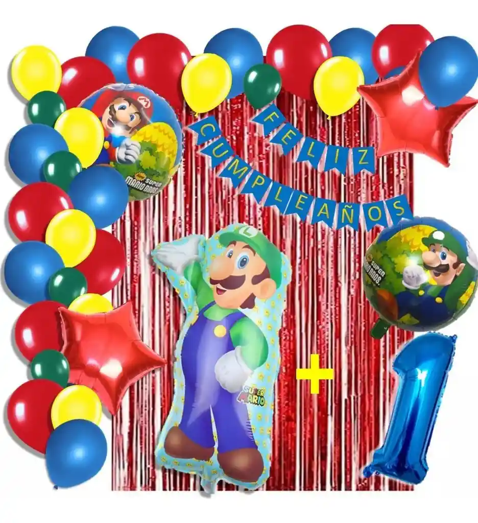 *********************GLOBOS Y PELUCHES MASMELO********************* --------------------------Somos Mercado Lider Platinum------------------------ Por tu compra te llevas. 2 Cortina rojo 1x2 metros 100 Globos surtidos: amarillo rojo azul, verde 30cm y 13cm R12 y R6 colores iguales a la foto suficientes para un arco orgánico de globos de 5 metros 2 Globo circular temática Mario Bros 45x45cm 1 Globo Luigi 70x45 cm 2 Globo estrella Rojo 45x45cm 1 Globo número azul segun tu elección 82 cm de altura 1 guirnalda feston feliz cumpleaños 2 metros de largo 7 metros de nylon para amarrar globos 1 Cinta de 100 Puntos Adhesivos *Los globos se entregan desinflados, tu compra no incluye el montaje ni la decoración, el servicio de armado no lo tenemos disponible. sin embargo te damos todas las instrucciones para hacer de modo profesional. Si deseas adicionar otros articulos a tu compra puedes escribirnos, recuerda que Somos Globos y Peluches Masmelo ;) Si necesitas variación en los colores, colocar un número, más globos o realizar otros cambios en el diseño original escribenos para ver si podemos hacerlo. Tenemos todo lo necesario para tus decoraciones, somos lo último en tendencias mundiales decorativas. Tenemos disponible: Vasos, platos, manteles, guirnaldas, cubiertos, globos de todo tipo, números, letreros, vela, Etc. Puedes encontrar los articulos de nuestra tienda en el siguiente link, copia y pega, si no encuentas lo que necesitas escribenos: https://www.rappi.com.co/tiendas/900280040-globosypeluchesmasmelo-mt-enc/decoracion-para-fiestas/globos-y-bombas - En ciudades fuera de Bogotá despachamos para el mismo día si compras antes de las 11AM (no incluye festivos) - En Bogotá despachamos para el mismo día, si haces el pedido antes de las 4PM (no incluye festivos)