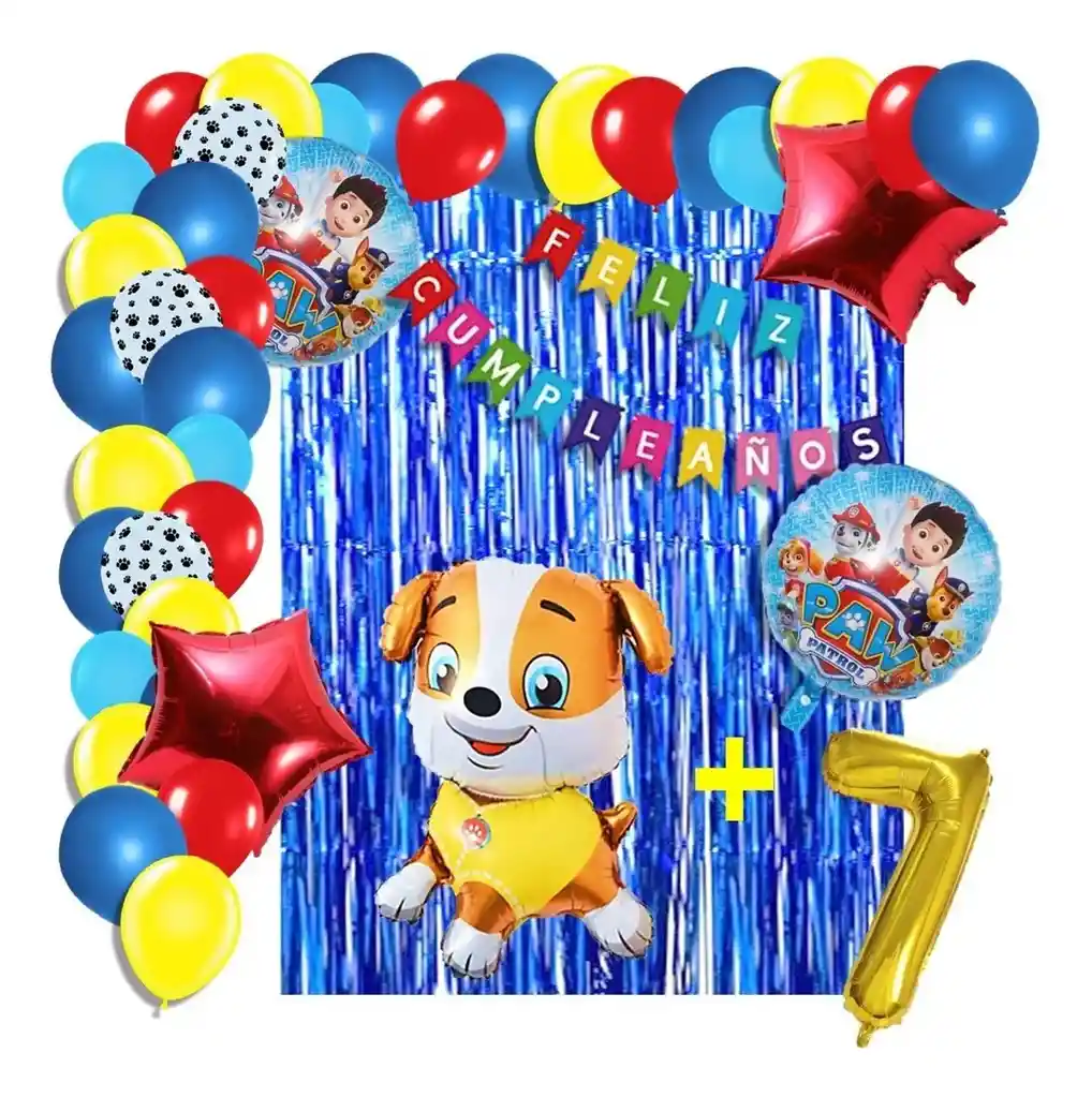 *********************GLOBOS Y PELUCHES MASMELO********************* Por tu compra te llevas. 2 Cortina azul 1×2 metros 100 Globos surtidos: amarillo, azul rey, azul pastel, blanco con huellas de perro, rojo 30cm y 13cm R12 y R6 colores iguales a la foto suficientes para un arco orgánico de globos de 5 metros 2 Globo circular temática Patrulla Canina 45x45cm 1 Globo Perro Rubble 65×45 cm 2 Globo estrella rojo 45x45cm 1 Globo número dorado segun tu elección 82 cm de altura 1 guirnalda feston feliz cumpleaños 2 metros de largo 7 metros de nylon para amarrar globos 1 Cinta de 100 Puntos Adhesivos *Los globos se entregan desinflados, tu compra no incluye el montaje ni la decoración, el servicio de armado no lo tenemos disponible. sin embargo te damos todas las instrucciones para hacer de modo profesional. Si deseas adicionar otros articulos a tu compra puedes escribirnos, recuerda que Somos Globos y Peluches Masmelo Si necesitas variación en los colores, colocar un número, más globos o realizar otros cambios en el diseño original escribenos para ver si podemos hacerlo. Tenemos todo lo necesario para tus decoraciones, somos lo último en tendencias mundiales decorativas. Tenemos disponible: Vasos, platos, manteles, guirnaldas, cubiertos, globos de todo tipo, números, letreros, vela, Etc. Puedes encontrar los articulos de nuestra tienda en el siguiente link, copia y pega, si no encuentas lo que necesitas escribenos: https://www.rappi.com.co/tiendas/900280040-globosypeluchesmasmelo-mt-enc/decoracion-para-fiestas/globos-y-bombas