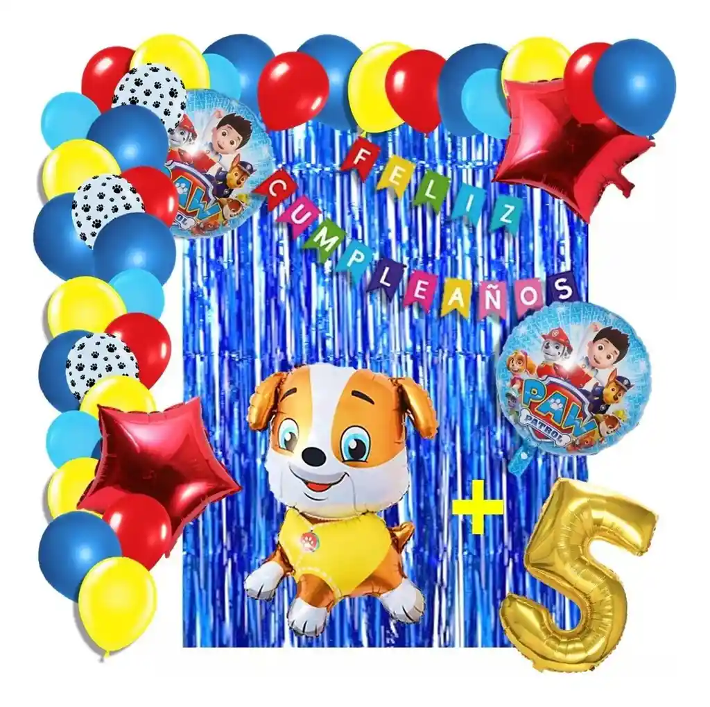 *********************GLOBOS Y PELUCHES MASMELO********************* Por tu compra te llevas. 2 Cortina azul 1×2 metros 100 Globos surtidos: amarillo, azul rey, azul pastel, blanco con huellas de perro, rojo 30cm y 13cm R12 y R6 colores iguales a la foto suficientes para un arco orgánico de globos de 5 metros 2 Globo circular temática Patrulla Canina 45x45cm 1 Globo Perro Rubble 65×45 cm 2 Globo estrella rojo 45x45cm 1 Globo número dorado segun tu elección 82 cm de altura 1 guirnalda feston feliz cumpleaños 2 metros de largo 7 metros de nylon para amarrar globos 1 Cinta de 100 Puntos Adhesivos *Los globos se entregan desinflados, tu compra no incluye el montaje ni la decoración, el servicio de armado no lo tenemos disponible. sin embargo te damos todas las instrucciones para hacer de modo profesional. Si deseas adicionar otros articulos a tu compra puedes escribirnos, recuerda que Somos Globos y Peluches Masmelo Si necesitas variación en los colores, colocar un número, más globos o realizar otros cambios en el diseño original escribenos para ver si podemos hacerlo. Tenemos todo lo necesario para tus decoraciones, somos lo último en tendencias mundiales decorativas. Tenemos disponible: Vasos, platos, manteles, guirnaldas, cubiertos, globos de todo tipo, números, letreros, vela, Etc. Puedes encontrar los articulos de nuestra tienda en el siguiente link, copia y pega, si no encuentas lo que necesitas escribenos: https://www.rappi.com.co/tiendas/900280040-globosypeluchesmasmelo-mt-enc/decoracion-para-fiestas/globos-y-bombas