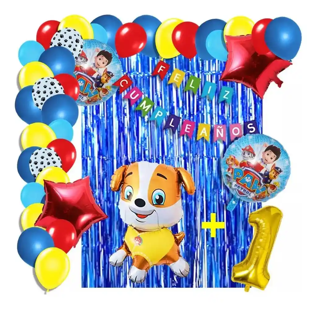 *********************GLOBOS Y PELUCHES MASMELO********************* Por tu compra te llevas. 2 Cortina azul 1×2 metros 100 Globos surtidos: amarillo, azul rey, azul pastel, blanco con huellas de perro, rojo 30cm y 13cm R12 y R6 colores iguales a la foto suficientes para un arco orgánico de globos de 5 metros 2 Globo circular temática Patrulla Canina 45x45cm 1 Globo Perro Rubble 65×45 cm 2 Globo estrella rojo 45x45cm 1 Globo número dorado segun tu elección 82 cm de altura 1 guirnalda feston feliz cumpleaños 2 metros de largo 7 metros de nylon para amarrar globos 1 Cinta de 100 Puntos Adhesivos *Los globos se entregan desinflados, tu compra no incluye el montaje ni la decoración, el servicio de armado no lo tenemos disponible. sin embargo te damos todas las instrucciones para hacer de modo profesional. Si deseas adicionar otros articulos a tu compra puedes escribirnos, recuerda que Somos Globos y Peluches Masmelo Si necesitas variación en los colores, colocar un número, más globos o realizar otros cambios en el diseño original escribenos para ver si podemos hacerlo. Tenemos todo lo necesario para tus decoraciones, somos lo último en tendencias mundiales decorativas. Tenemos disponible: Vasos, platos, manteles, guirnaldas, cubiertos, globos de todo tipo, números, letreros, vela, Etc. Puedes encontrar los articulos de nuestra tienda en el siguiente link, copia y pega, si no encuentas lo que necesitas escribenos: https://www.rappi.com.co/tiendas/900280040-globosypeluchesmasmelo-mt-enc/decoracion-para-fiestas/globos-y-bombas