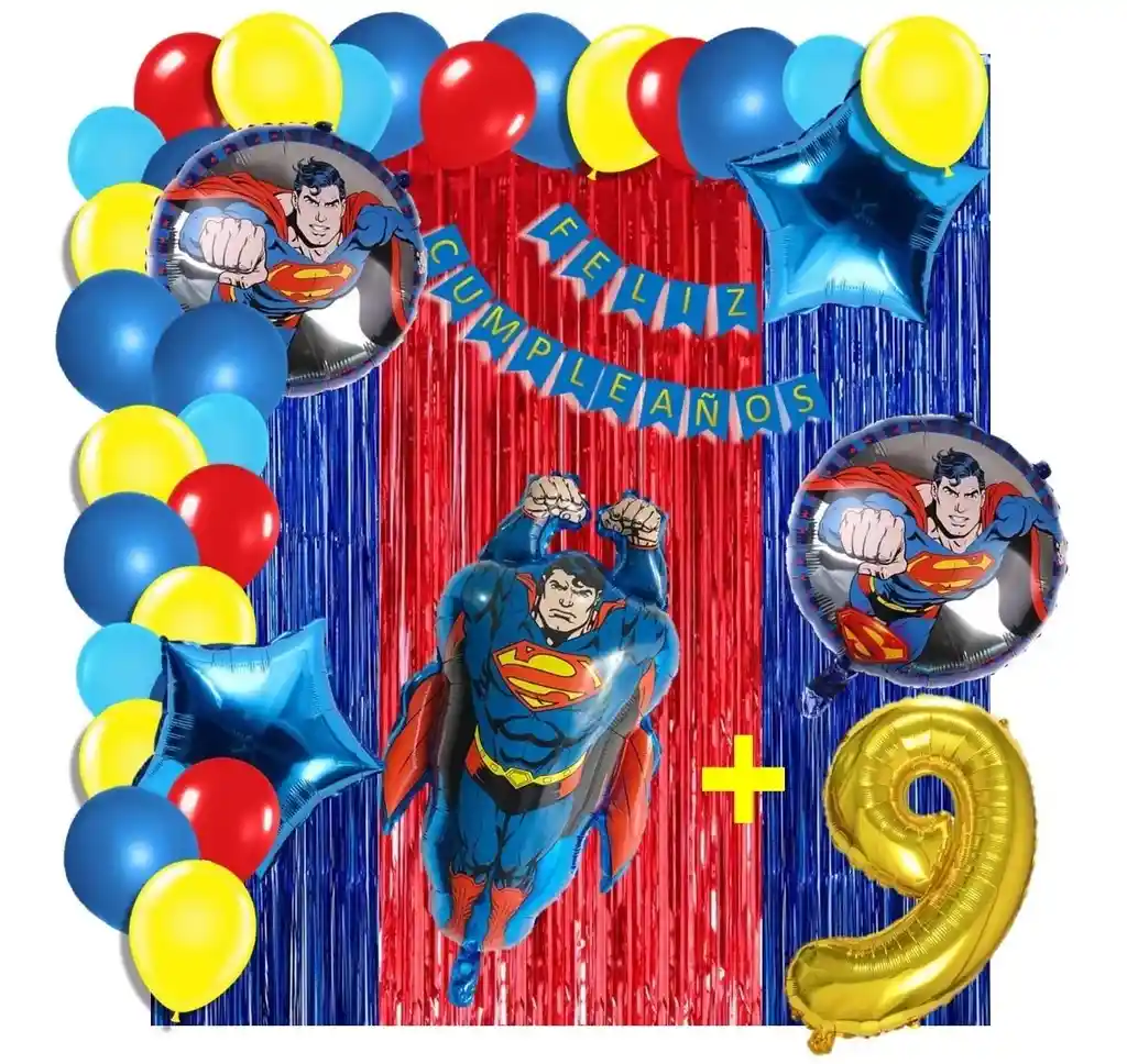 *********************GLOBOS Y PELUCHES MASMELO********************* Por tu compra te llevas. 2 Cortina azul y rojo 1×2 metros 100 Globos surtidos: amarillo, azul rey, azul pastel 30cm y 13cm R12 y R6 colores iguales a la foto suficientes para un arco orgánico de globos de 5 metros 2 Globo circular temática Superman 45x45cm 1 Globo Superman 70×45 cm 2 Globo estrella azul 45x45cm 1 Globo número dorado segun tu elección 82 cm de altura 1 guirnalda feston feliz cumpleaños 2 metros de largo 7 metros de nylon para amarrar globos 1 Cinta de 100 Puntos Adhesivos *Los globos se entregan desinflados, tu compra no incluye el montaje ni la decoración, el servicio de armado no lo tenemos disponible. sin embargo te damos todas las instrucciones para hacer de modo profesional. Si deseas adicionar otros articulos a tu compra puedes escribirnos, recuerda que Somos Globos y Peluches Masmelo Si necesitas variación en los colores, colocar un número, más globos o realizar otros cambios en el diseño original escribenos para ver si podemos hacerlo. Tenemos todo lo necesario para tus decoraciones, somos lo último en tendencias mundiales decorativas. Tenemos disponible: Vasos, platos, manteles, guirnaldas, cubiertos, globos de todo tipo, números, letreros, vela, Etc. Puedes encontrar los articulos de nuestra tienda en el siguiente link, copia y pega, si no encuentas lo que necesitas escribenos: https://www.rappi.com.co/tiendas/900280040-globosypeluchesmasmelo-mt-enc/decoracion-para-fiestas/globos-y-bombas