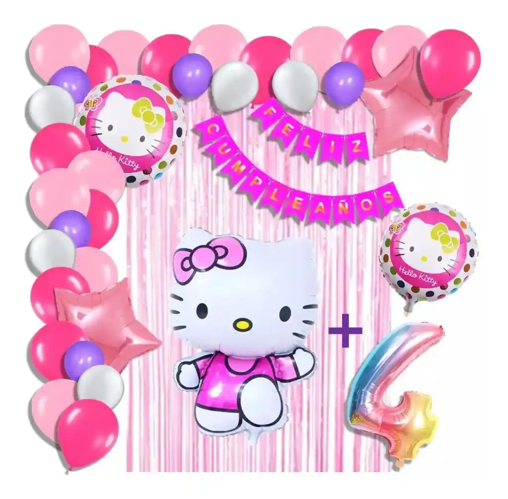 *********************GLOBOS Y PELUCHES MASMELO********************* Por tu compra te llevas. 2 Cortina oro rosa 1×2 metros 100 Globos surtidos: rosado, fucsia, morado blanco 30cm y 13cm R12 y R6 colores iguales a la foto suficientes para un arco orgánico de globos de 5 metros 2 Globo circular temática Kitty 45x45cm 1 Globo Kitty 90x70cm 2 Globo estrella rosado 45x45cm 1 guirnalda feston Feliz cumpleaños 2 metros de largo 1 Globo Número Tornasol segun tu elección del 1 al 9 altura 82 cm 7 metros de nylon para amarrar globos 1 Cinta de 100 Puntos Adhesivos *Los globos se entregan desinflados, tu compra no incluye el montaje ni la decoración, el servicio de armado no lo tenemos disponible. sin embargo te damos todas las instrucciones para hacer de modo profesional. Si deseas adicionar otros articulos a tu compra puedes escribirnos, recuerda que Somos Globos y Peluches Masmelo Si necesitas variación en los colores, colocar un número, más globos o realizar otros cambios en el diseño original escribenos para ver si podemos hacerlo. Tenemos todo lo necesario para tus decoraciones, somos lo último en tendencias mundiales decorativas. Tenemos disponible: Vasos, platos, manteles, guirnaldas, cubiertos, globos de todo tipo, números, letreros, vela, Etc. Puedes encontrar los articulos de nuestra tienda en el siguiente link, copia y pega, si no encuentas lo que necesitas escribenos: https://www.rappi.com.co/tiendas/900280040-globosypeluchesmasmelo-mt-enc/decoracion-para-fiestas/globos-y-bombas