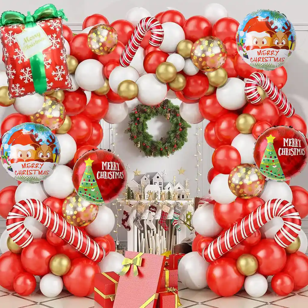 *********************GLOBOS Y PELUCHES MASMELO********************* ————————-Somos Mercado Líder Platinum———————— Te damos toda la asesoría para que tú puedas armar tu propio arco Por tu compra te llevas: 2 Globo bastón navidad 70x35 cm 4 Globo circular navidad 45x45cm 2 Globo bastón navidad 45x20 cm 1 Globo caja de regalo 65x45cm 20 Globo dorado cromado 13 cm 5 Globo transparente confeti dorado 30 cm 40 Globo rojo 30 cm 20 Globo rojo 13 cm 30 Globo blanco 30 cm 10 Globo blanco 13 cm Accesorios: 1 Cinta de arco 5 metros 1 Pegatina 100 puntos adhesivos *No incluye fondo decorativo no está disponible. * Los globos se entregan desinflados, tu compra no incluye el montaje ni la decoración, el servicio de armado no lo tenemos disponible. sin embargo te damos todas las instrucciones para hacer de modo profesional. Si deseas adicionar otros artículos a tu compra puedes escribirnos, recuerda que Somos Globos y Peluches Masmelo Si necesitas variación en los colores, colocar un número, más globos o realizar otros cambios en el diseño original escríbenos para ver si podemos hacerlo. Tenemos todo lo necesario para tus decoraciones, somos lo último en tendencias mundiales decorativas. Tenemos disponible: Vasos, platos, manteles, guirnaldas, cubiertos, globos de todo tipo, números, letreros, vela, Etc. Puedes encontrar los artículos de nuestra tienda en el siguiente link, copia y pega, si no encuentras lo que necesitas escríbenos: https://www.rappi.com.co/tiendas/900280040-globosypeluchesmasmelo-mt-enc/decoracion-para-fiestas/globos-y-bombas