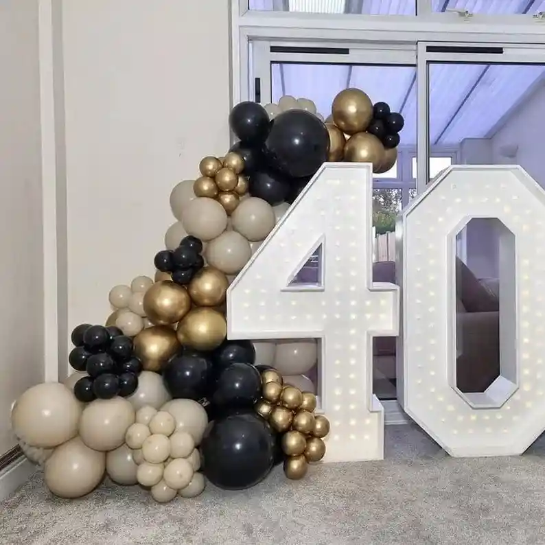 *********************GLOBOS Y PELUCHES MASMELO********************* Por tu compra te llevas: 35 Globo arena 30 cm 20 Globo arena 13 cm 20 Globo dorado cromado 30 cm 25 Globo negro 30 cm 25 Globo negro 13 cm 15 Globo dorado cromado 30 cm 1 Cinta para hacer arcos 1 Cinta de 100 puntos adhesivos *Los globos se entregan desinflados, tu compra no incluye el montaje ni la decoración, el servicio de armado no lo tenemos disponible. sin embargo te damos todas las instrucciones para hacer de modo profesional. Si deseas adicionar otros artículos a tu compra puedes escribirnos, recuerda que Somos Globos y Peluches Masmelo Si necesitas variación en los colores, colocar un número, más globos o realizar otros cambios en el diseño original escríbenos para ver si podemos hacerlo. Tenemos todo lo necesario para tus decoraciones, somos lo último en tendencias mundiales decorativas. Tenemos disponible: Vasos, platos, manteles, guirnaldas, cubiertos, globos de todo tipo, números, letreros, vela, Etc. Puedes encontrar los artículos de nuestra tienda en el siguiente link, copia y pega, si no encuentras lo que necesitas escríbenos: https://www.rappi.com.co/tiendas/900280040-globosypeluchesmasmelo-mt-enc/decoracion-para-fiestas/globos-y-bombas