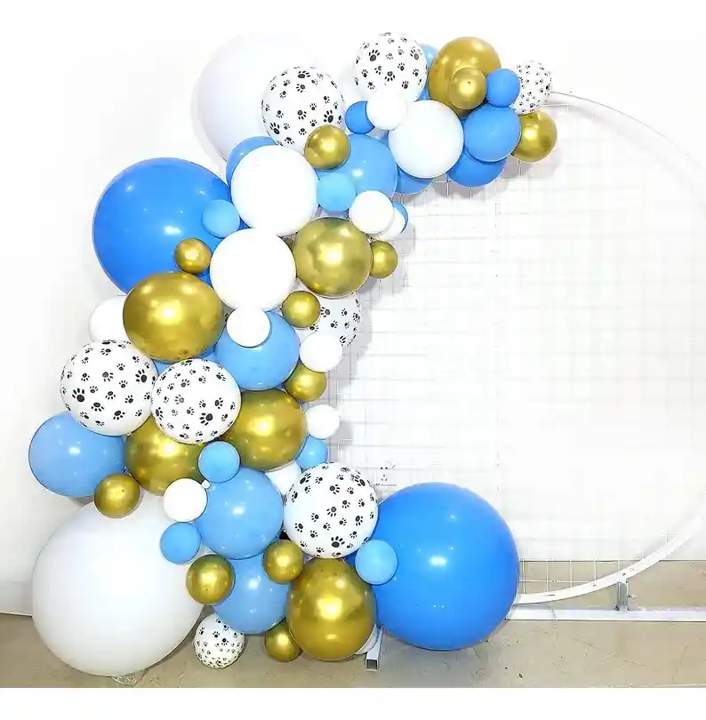 *********************GLOBOS Y PELUCHES MASMELO********************* --------------------------Somos Mercado Lider Platinum------------------------ Por tu compra te llevas. 2 Globo azul pastel 45 cm 2 Globo blanco 45 cm 8 Globo huellitas de perro cm 15 Globo dorado cromado 30 cm 15 Globo dorado cromado 13 cm 20 Globo azul pastel 30 cm 15 Globo azul pastel 13 cm 20 Globo blanco 30 cm 15 Globo blanco 13 cm 8 metros de nylon 3 Metros de Nylon 1 Cinta de 100 puntos adhesivos El arco tiene un largo de 5 metros y el mini arco 1,5 metros de largo el nylon adicional es para pegar en las paredes o puntos de apoyo. * No incluye hojas, No include mariposas, no incluye mobiliario, no incluye follaje ni rosas Los Globos se entregan desinflados, tu compra no incluye el montaje ni la decoración, el servicio de armado no lo tenemos disponible. sin embargo te damos todas las instrucciones para hacerlo de modo profesional. Si deseas adicionar otros articulos a tu compra puedes escribirnos, recuerda que Somos Globos y Peluches Masmelo ;) Si necesitas variación en los colores, colocar un número, más globos o realizar otros cambios en el diseño original escribenos para ver si podemos hacerlo. Tenemos todo lo necesario para tus decoraciones, somos lo último en tendencias mundiales decorativas. Tenemos disponible: Vasos, platos, manteles, guirnaldas, cubiertos, globos de todo tipo, números, letreros, vela, Etc. Puedes encontrar los articulos de nuestra tienda en el siguiente link, copia y pega, si no encuentas lo que necesitas escribenos: https://www.rappi.com.co/tiendas/900280040-globosypeluchesmasmelo-mt-enc/decoracion-para-fiestas/globos-y-bombas - En ciudades fuera de Bogotá despachamos para el mismo día si compras antes de las 11AM (no incluye festivos) - En Bogotá despachamos para el mismo día, si haces el pedido antes de las 4PM (no incluye festivos)