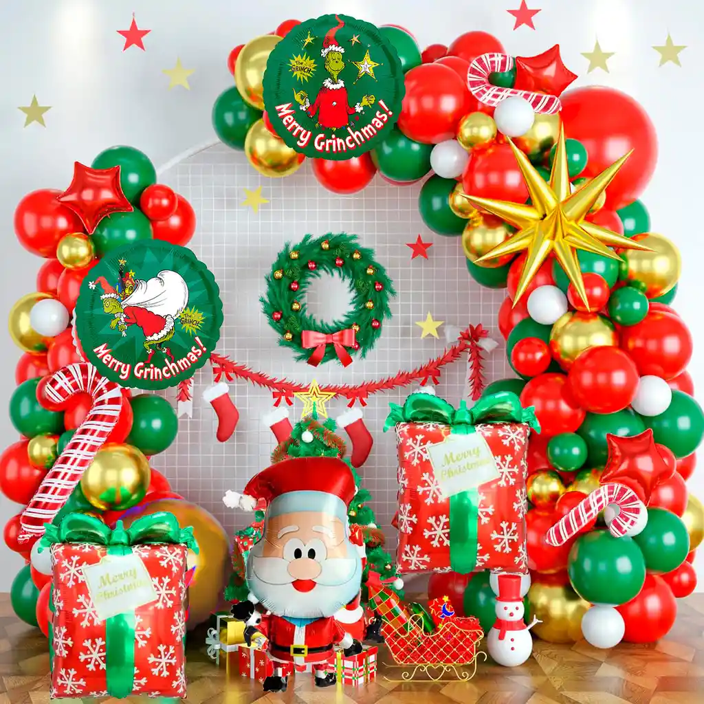 *********************GLOBOS Y PELUCHES MASMELO********************* ————————-Somos Mercado Líder Platinum———————— Te damos toda la asesoría para que tú puedas armar tu propio arco Por tu compra te llevas: 1 Globo dorado cromado 45cm 1 Globo rojo 45cm 1 Globo estrella explosiva 60x60cm 2 Globo circular navidad 45x45cm 2 Globo bastón 70x30cm 1 Globo bastón 45x20cm 2 Globo regalo de navidad 65x45cm 2 Globo estrella roja 25x25 cm 10 Globo cromado dorado 30 cm 10 Globo dorado cromado 13 cm 1 Globo papa Noel 65x45cm 30 Globo verde selva 30 cm 15 Globo verde selva 13 cm 35 Globo verde rojo 30 cm 30 Globo rojo 30 cm 15 Globo rojo 13 cm Accesorios: 1 Cinta de arco 5 metros 1 Pegatina 100 puntos adhesivos *No incluye fondo decorativo no está disponible. * Los globos se entregan desinflados, tu compra no incluye el montaje ni la decoración, el servicio de armado no lo tenemos disponible. sin embargo te damos todas las instrucciones para hacer de modo profesional. Si deseas adicionar otros artículos a tu compra puedes escribirnos, recuerda que Somos Globos y Peluches Masmelo Si necesitas variación en los colores, colocar un número, más globos o realizar otros cambios en el diseño original escríbenos para ver si podemos hacerlo. Tenemos todo lo necesario para tus decoraciones, somos lo último en tendencias mundiales decorativas. Tenemos disponible: Vasos, platos, manteles, guirnaldas, cubiertos, globos de todo tipo, números, letreros, vela, Etc. Puedes encontrar los artículos de nuestra tienda en el siguiente link, copia y pega, si no encuentras lo que necesitas escríbenos: https://www.rappi.com.co/tiendas/900280040-globosypeluchesmasmelo-mt-enc/decoracion-para-fiestas/globos-y-bombas