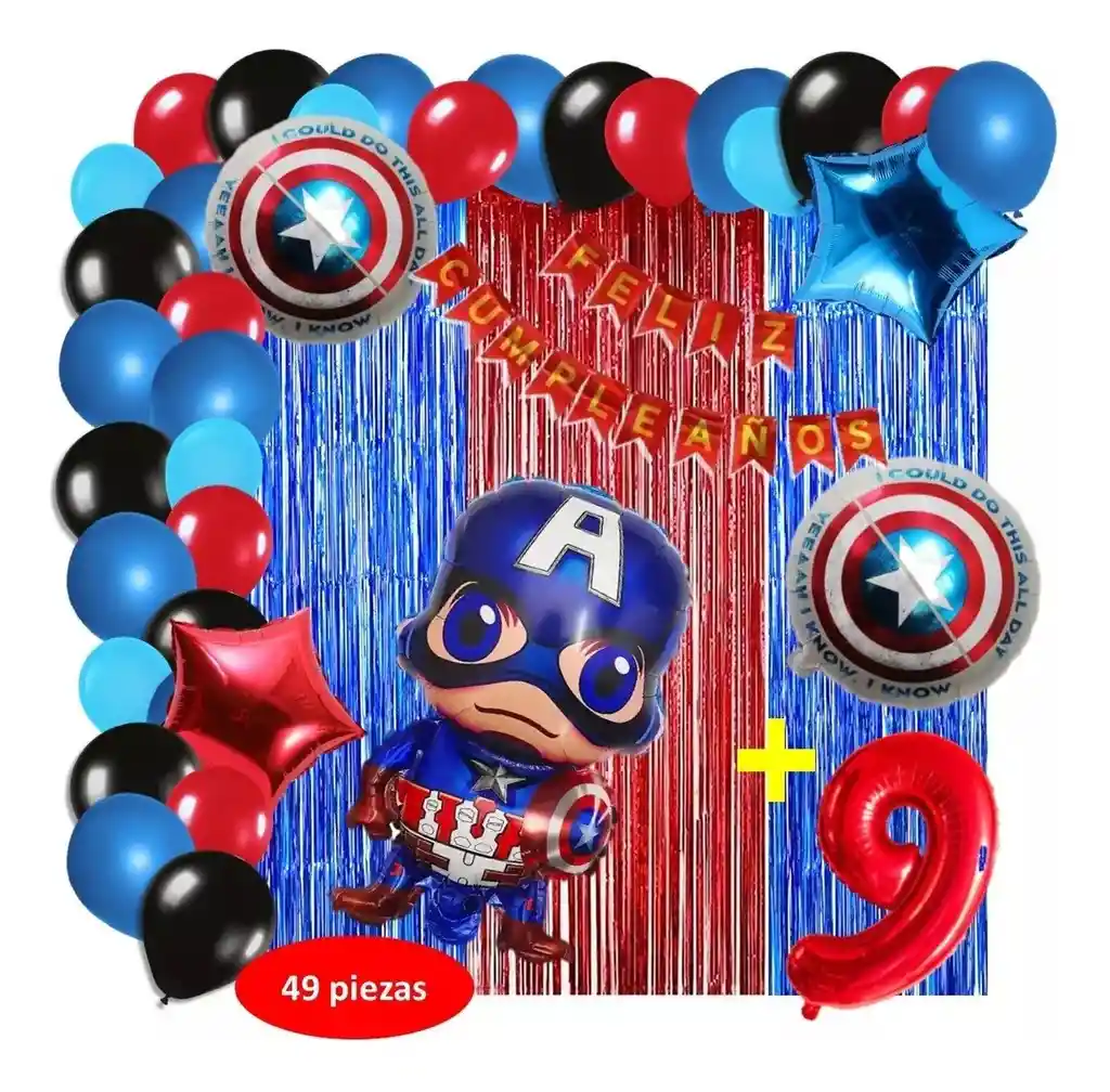 *********************GLOBOS Y PELUCHES MASMELO********************* Por tu compra te llevas. 2 Cortina azul rojo 1×2 metros 100 Globos surtidos: azul, negro, rojo, azul pastel 30cm y 13cm R12 y R6 colores iguales a la foto suficientes para un arco orgánico de globos de 5 metros 2 Globo circular temática Capitán América 45x45cm 1 Globo Capitán América 65x45cm 2 Globo estrella rojo y azul 45x45cm 1 guirnalda feston Feliz cumpleaños 2 metros de largo 1 Globo Número rojo segun tu elección del 1 al 9 altura 82 cm 7 metros de nylon para amarrar globos 1 Cinta de 100 Puntos Adhesivos *Los globos se entregan desinflados, tu compra no incluye el montaje ni la decoración, el servicio de armado no lo tenemos disponible. sin embargo te damos todas las instrucciones para hacer de modo profesional. Si deseas adicionar otros articulos a tu compra puedes escribirnos, recuerda que Somos Globos y Peluches Masmelo Si necesitas variación en los colores, colocar un número, más globos o realizar otros cambios en el diseño original escribenos para ver si podemos hacerlo. Tenemos todo lo necesario para tus decoraciones, somos lo último en tendencias mundiales decorativas. Tenemos disponible: Vasos, platos, manteles, guirnaldas, cubiertos, globos de todo tipo, números, letreros, vela, Etc. Puedes encontrar los articulos de nuestra tienda en el siguiente link, copia y pega, si no encuentas lo que necesitas escribenos: https://www.rappi.com.co/tiendas/900280040-globosypeluchesmasmelo-mt-enc/decoracion-para-fiestas/globos-y-bombas