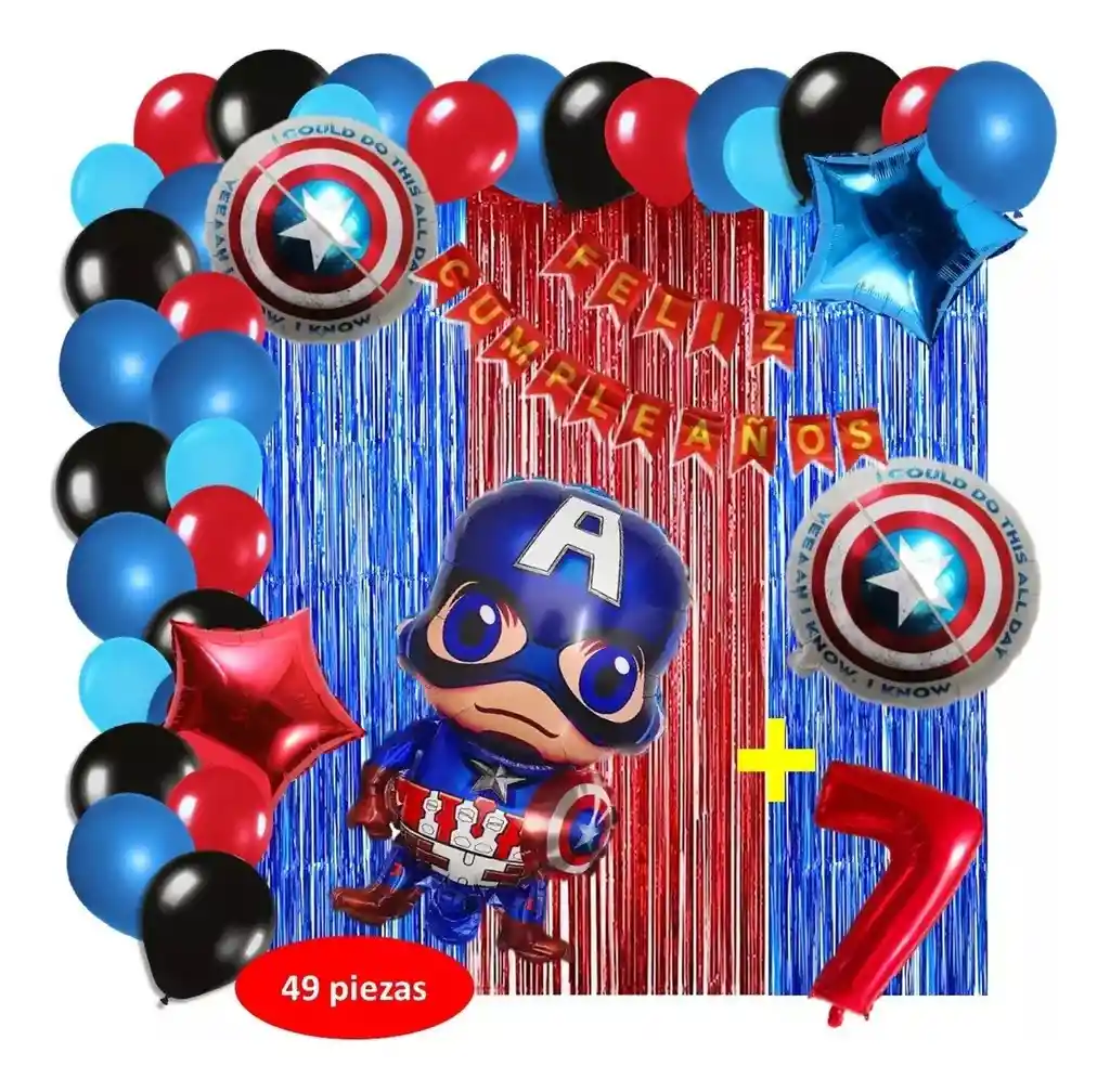 *********************GLOBOS Y PELUCHES MASMELO********************* Por tu compra te llevas. 2 Cortina azul rojo 1×2 metros 100 Globos surtidos: azul, negro, rojo, azul pastel 30cm y 13cm R12 y R6 colores iguales a la foto suficientes para un arco orgánico de globos de 5 metros 2 Globo circular temática Capitán América 45x45cm 1 Globo Capitán América 65x45cm 2 Globo estrella rojo y azul 45x45cm 1 guirnalda feston Feliz cumpleaños 2 metros de largo 1 Globo Número rojo segun tu elección del 1 al 9 altura 82 cm 7 metros de nylon para amarrar globos 1 Cinta de 100 Puntos Adhesivos *Los globos se entregan desinflados, tu compra no incluye el montaje ni la decoración, el servicio de armado no lo tenemos disponible. sin embargo te damos todas las instrucciones para hacer de modo profesional. Si deseas adicionar otros articulos a tu compra puedes escribirnos, recuerda que Somos Globos y Peluches Masmelo Si necesitas variación en los colores, colocar un número, más globos o realizar otros cambios en el diseño original escribenos para ver si podemos hacerlo. Tenemos todo lo necesario para tus decoraciones, somos lo último en tendencias mundiales decorativas. Tenemos disponible: Vasos, platos, manteles, guirnaldas, cubiertos, globos de todo tipo, números, letreros, vela, Etc. Puedes encontrar los articulos de nuestra tienda en el siguiente link, copia y pega, si no encuentas lo que necesitas escribenos: https://www.rappi.com.co/tiendas/900280040-globosypeluchesmasmelo-mt-enc/decoracion-para-fiestas/globos-y-bombas