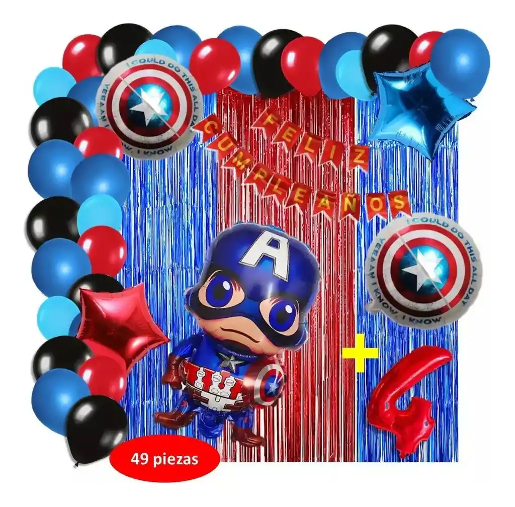 *********************GLOBOS Y PELUCHES MASMELO********************* Por tu compra te llevas. 2 Cortina azul rojo 1×2 metros 100 Globos surtidos: azul, negro, rojo, azul pastel 30cm y 13cm R12 y R6 colores iguales a la foto suficientes para un arco orgánico de globos de 5 metros 2 Globo circular temática Capitán América 45x45cm 1 Globo Capitán América 65x45cm 2 Globo estrella rojo y azul 45x45cm 1 guirnalda feston Feliz cumpleaños 2 metros de largo 1 Globo Número rojo segun tu elección del 1 al 9 altura 82 cm 7 metros de nylon para amarrar globos 1 Cinta de 100 Puntos Adhesivos *Los globos se entregan desinflados, tu compra no incluye el montaje ni la decoración, el servicio de armado no lo tenemos disponible. sin embargo te damos todas las instrucciones para hacer de modo profesional. Si deseas adicionar otros articulos a tu compra puedes escribirnos, recuerda que Somos Globos y Peluches Masmelo Si necesitas variación en los colores, colocar un número, más globos o realizar otros cambios en el diseño original escribenos para ver si podemos hacerlo. Tenemos todo lo necesario para tus decoraciones, somos lo último en tendencias mundiales decorativas. Tenemos disponible: Vasos, platos, manteles, guirnaldas, cubiertos, globos de todo tipo, números, letreros, vela, Etc. Puedes encontrar los articulos de nuestra tienda en el siguiente link, copia y pega, si no encuentas lo que necesitas escribenos: https://www.rappi.com.co/tiendas/900280040-globosypeluchesmasmelo-mt-enc/decoracion-para-fiestas/globos-y-bombas