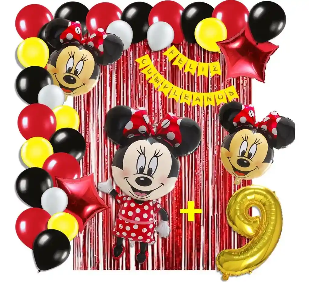 *********************GLOBOS Y PELUCHES MASMELO********************* Por tu compra te llevas. 2 Cortina Rojo 1×2 metros 100 Globos surtidos: Amarillo, negro, blanco, rojo 30cm y 13cm R12 y R6 colores iguales a la foto suficientes para un arco orgánico de globos de 5 metros 2 Globo circular temática Minnie Mouse 45x45cm 1 Globo Minnie Mouse 65×45 cm 2 Globo estrella rojo 45x45cm 1 guirnalda feston Feliz cumpleaños 2 metros de largo 1 Globo Número dorado segun tu elección del 1 al 9 altura 82 cm 7 metros de nylon para amarrar globos 1 Cinta de 100 Puntos Adhesivos *Los globos se entregan desinflados, tu compra no incluye el montaje ni la decoración, el servicio de armado no lo tenemos disponible. sin embargo te damos todas las instrucciones para hacer de modo profesional. Si deseas adicionar otros articulos a tu compra puedes escribirnos, recuerda que Somos Globos y Peluches Masmelo Si necesitas variación en los colores, colocar un número, más globos o realizar otros cambios en el diseño original escribenos para ver si podemos hacerlo. Tenemos todo lo necesario para tus decoraciones, somos lo último en tendencias mundiales decorativas. Tenemos disponible: Vasos, platos, manteles, guirnaldas, cubiertos, globos de todo tipo, números, letreros, vela, Etc. Puedes encontrar los articulos de nuestra tienda en el siguiente link, copia y pega, si no encuentas lo que necesitas escribenos: https://www.rappi.com.co/tiendas/900280040-globosypeluchesmasmelo-mt-enc/decoracion-para-fiestas/globos-y-bombas