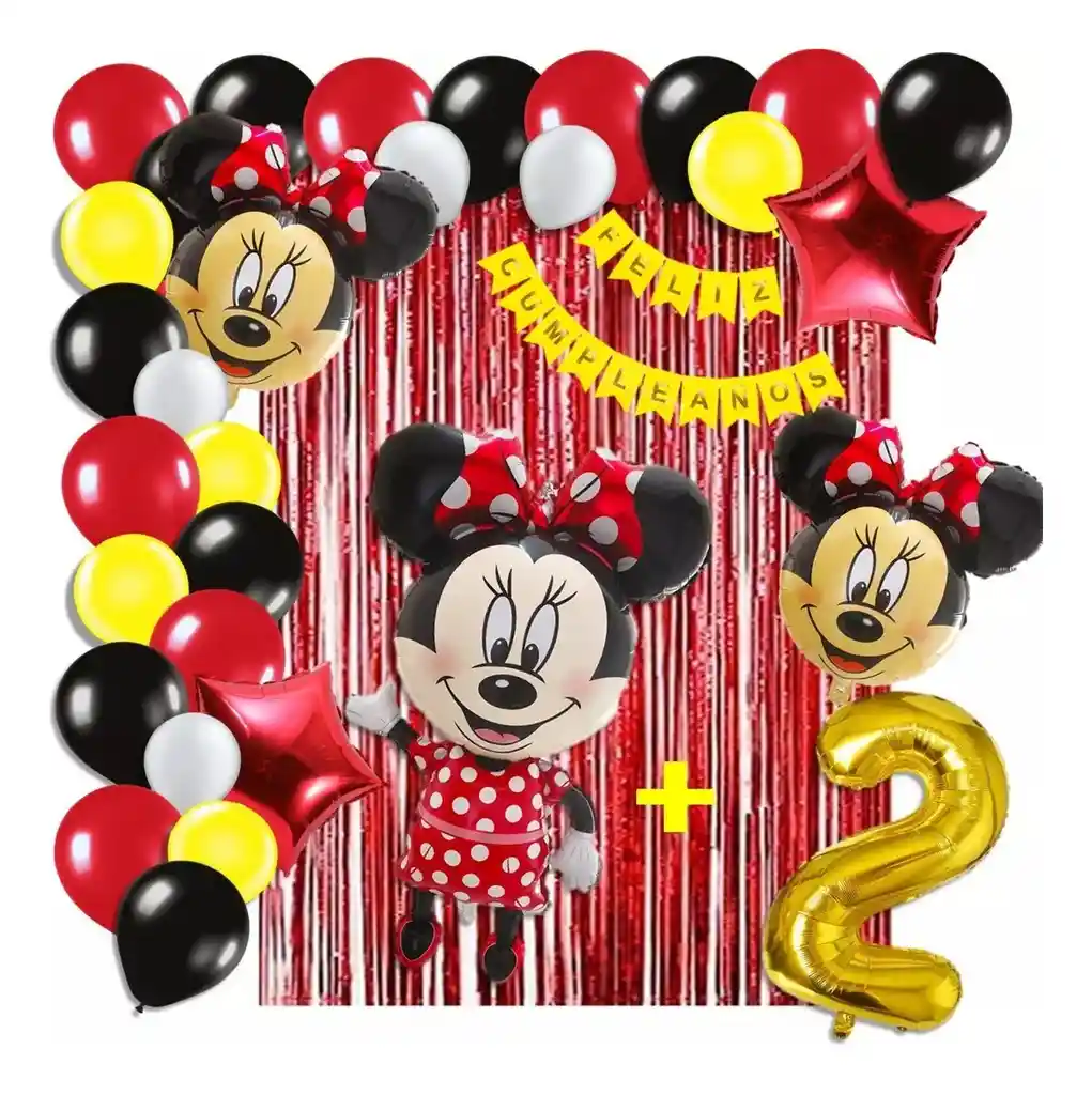 *********************GLOBOS Y PELUCHES MASMELO********************* Por tu compra te llevas. 2 Cortina Rojo 1×2 metros 100 Globos surtidos: Amarillo, negro, blanco, rojo 30cm y 13cm R12 y R6 colores iguales a la foto suficientes para un arco orgánico de globos de 5 metros 2 Globo circular temática Minnie Mouse 45x45cm 1 Globo Minnie Mouse 65×45 cm 2 Globo estrella rojo 45x45cm 1 guirnalda feston Feliz cumpleaños 2 metros de largo 1 Globo Número dorado segun tu elección del 1 al 9 altura 82 cm 7 metros de nylon para amarrar globos 1 Cinta de 100 Puntos Adhesivos *Los globos se entregan desinflados, tu compra no incluye el montaje ni la decoración, el servicio de armado no lo tenemos disponible. sin embargo te damos todas las instrucciones para hacer de modo profesional. Si deseas adicionar otros articulos a tu compra puedes escribirnos, recuerda que Somos Globos y Peluches Masmelo Si necesitas variación en los colores, colocar un número, más globos o realizar otros cambios en el diseño original escribenos para ver si podemos hacerlo. Tenemos todo lo necesario para tus decoraciones, somos lo último en tendencias mundiales decorativas. Tenemos disponible: Vasos, platos, manteles, guirnaldas, cubiertos, globos de todo tipo, números, letreros, vela, Etc. Puedes encontrar los articulos de nuestra tienda en el siguiente link, copia y pega, si no encuentas lo que necesitas escribenos: https://www.rappi.com.co/tiendas/900280040-globosypeluchesmasmelo-mt-enc/decoracion-para-fiestas/globos-y-bombas