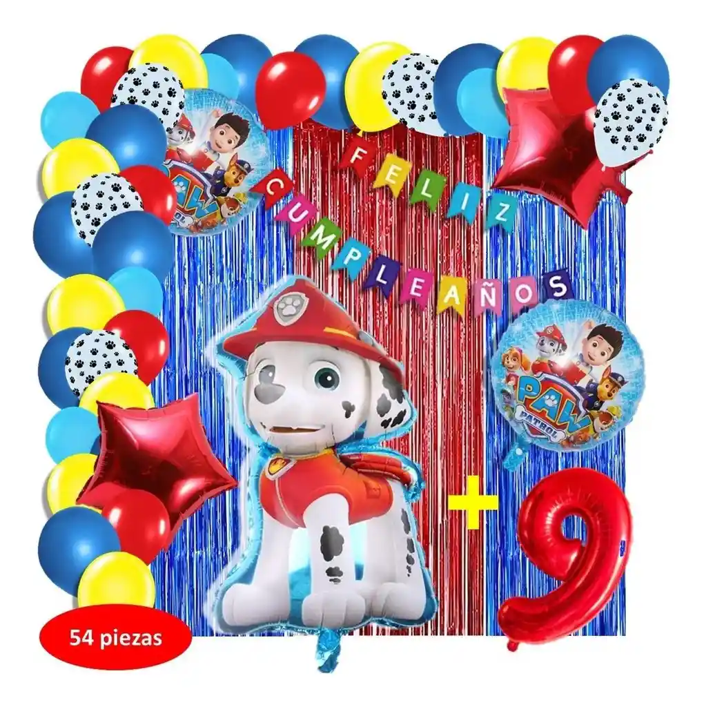 *********************GLOBOS Y PELUCHES MASMELO********************* Por tu compra te llevas. 2 Cortina azul y roja 1×2 metros 100 Globos surtidos: amarillo, azul pastel, rojo, blanco con huellitas de perro 30cm y 13cm R12 y R6 colores iguales a la foto suficientes para un arco orgánico de globos de 5 metros 2 Globo circular temática patrulla canina 45x45cm 1 Globo perro Dalmata 65×45 cm 2 Globo estrella roja 45x45cm 1 guirnalda feston Feliz cumpleaños 2 metros de largo 1 Globo Número rojo segun tu elección del 1 al 9 altura 82 cm 7 metros de nylon para amarrar globos 1 Cinta de 100 Puntos Adhesivos *Los globos se entregan desinflados, tu compra no incluye el montaje ni la decoración, el servicio de armado no lo tenemos disponible. sin embargo te damos todas las instrucciones para hacer de modo profesional. Si deseas adicionar otros articulos a tu compra puedes escribirnos, recuerda que Somos Globos y Peluches Masmelo Si necesitas variación en los colores, colocar un número, más globos o realizar otros cambios en el diseño original escribenos para ver si podemos hacerlo. Tenemos todo lo necesario para tus decoraciones, somos lo último en tendencias mundiales decorativas. Tenemos disponible: Vasos, platos, manteles, guirnaldas, cubiertos, globos de todo tipo, números, letreros, vela, Etc. Puedes encontrar los articulos de nuestra tienda en el siguiente link, copia y pega, si no encuentas lo que necesitas escribenos: https://www.rappi.com.co/tiendas/900280040-globosypeluchesmasmelo-mt-enc/decoracion-para-fiestas/globos-y-bombas