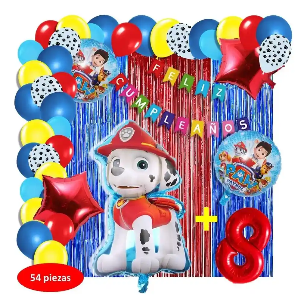*********************GLOBOS Y PELUCHES MASMELO********************* Por tu compra te llevas. 2 Cortina azul y roja 1×2 metros 100 Globos surtidos: amarillo, azul pastel, rojo, blanco con huellitas de perro 30cm y 13cm R12 y R6 colores iguales a la foto suficientes para un arco orgánico de globos de 5 metros 2 Globo circular temática patrulla canina 45x45cm 1 Globo perro Dalmata 65×45 cm 2 Globo estrella roja 45x45cm 1 guirnalda feston Feliz cumpleaños 2 metros de largo 1 Globo Número rojo segun tu elección del 1 al 9 altura 82 cm 7 metros de nylon para amarrar globos 1 Cinta de 100 Puntos Adhesivos *Los globos se entregan desinflados, tu compra no incluye el montaje ni la decoración, el servicio de armado no lo tenemos disponible. sin embargo te damos todas las instrucciones para hacer de modo profesional. Si deseas adicionar otros articulos a tu compra puedes escribirnos, recuerda que Somos Globos y Peluches Masmelo Si necesitas variación en los colores, colocar un número, más globos o realizar otros cambios en el diseño original escribenos para ver si podemos hacerlo. Tenemos todo lo necesario para tus decoraciones, somos lo último en tendencias mundiales decorativas. Tenemos disponible: Vasos, platos, manteles, guirnaldas, cubiertos, globos de todo tipo, números, letreros, vela, Etc. Puedes encontrar los articulos de nuestra tienda en el siguiente link, copia y pega, si no encuentas lo que necesitas escribenos: https://www.rappi.com.co/tiendas/900280040-globosypeluchesmasmelo-mt-enc/decoracion-para-fiestas/globos-y-bombas