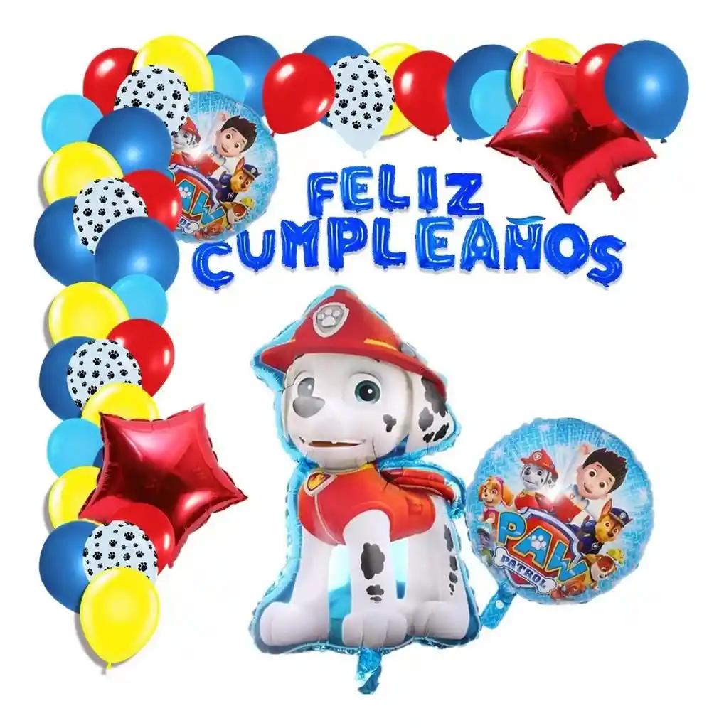 *********************GLOBOS Y PELUCHES MASMELO********************* Por tu compra te llevas. 100 Globos surtidos: amarillo, azul rey, azul pastel, rojo, blanco con patitas de perro 30cm y 13cm R12 y R6 colores iguales a la foto suficientes para un arco orgánico de globos de 5 metros 2 Globo circular temática patrulla canina 45x45cm 1 Globo Perro Dalmata Marshall 65×45 cm 2 Globo estrella rojo 45x45cm 1 Globo letrero feliz cumpleaños 40 cm de altura 7 metros de nylon para amarrar globos 1 Cinta de 100 Puntos Adhesivos *Los globos se entregan desinflados, tu compra no incluye el montaje ni la decoración, el servicio de armado no lo tenemos disponible. sin embargo te damos todas las instrucciones para hacer de modo profesional. Si deseas adicionar otros articulos a tu compra puedes escribirnos, recuerda que Somos Globos y Peluches Masmelo Si necesitas variación en los colores, colocar un número, más globos o realizar otros cambios en el diseño original escribenos para ver si podemos hacerlo. Tenemos todo lo necesario para tus decoraciones, somos lo último en tendencias mundiales decorativas. Tenemos disponible: Vasos, platos, manteles, guirnaldas, cubiertos, globos de todo tipo, números, letreros, vela, Etc. Puedes encontrar los articulos de nuestra tienda en el siguiente link, copia y pega, si no encuentas lo que necesitas escribenos: https://www.rappi.com.co/tiendas/900280040-globosypeluchesmasmelo-mt-enc/decoracion-para-fiestas/globos-y-bombas