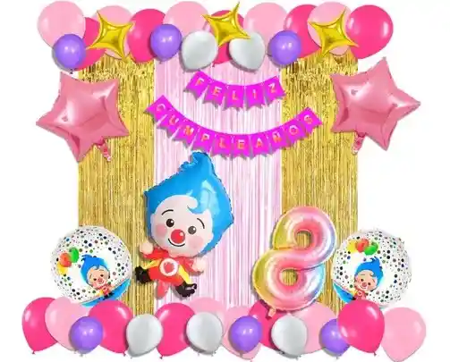 *********************GLOBOS Y PELUCHES MASMELO********************* Por tu compra te llevas. 2 Cortina oro rosa y dorada 1×2 metros 100 Globos surtidos: rosado, fucsia, morado ,blanco 30cm y 13cm R12 y R6 colores iguales a la foto suficientes para un arco orgánico de globos de 5 metros 2 Globo circular temática Payaso Plim 45x45cm 1 Globo Payaso Plim 65×45 cm 2 Globo estrella rosada 45x45cm 1 guirnalda feston Feliz cumpleaños 2 metros de largo 1 Globo Número tornasol segun tu elección del 1 al 9 altura 82 cm 7 metros de nylon para amarrar globos 1 Cinta de 100 Puntos Adhesivos *Los globos se entregan desinflados, tu compra no incluye el montaje ni la decoración, el servicio de armado no lo tenemos disponible. sin embargo te damos todas las instrucciones para hacer de modo profesional. Si deseas adicionar otros articulos a tu compra puedes escribirnos, recuerda que Somos Globos y Peluches Masmelo Si necesitas variación en los colores, colocar un número, más globos o realizar otros cambios en el diseño original escribenos para ver si podemos hacerlo. Tenemos todo lo necesario para tus decoraciones, somos lo último en tendencias mundiales decorativas. Tenemos disponible: Vasos, platos, manteles, guirnaldas, cubiertos, globos de todo tipo, números, letreros, vela, Etc. Puedes encontrar los articulos de nuestra tienda en el siguiente link, copia y pega, si no encuentas lo que necesitas escribenos: https://www.rappi.com.co/tiendas/900280040-globosypeluchesmasmelo-mt-enc/decoracion-para-fiestas/globos-y-bombas