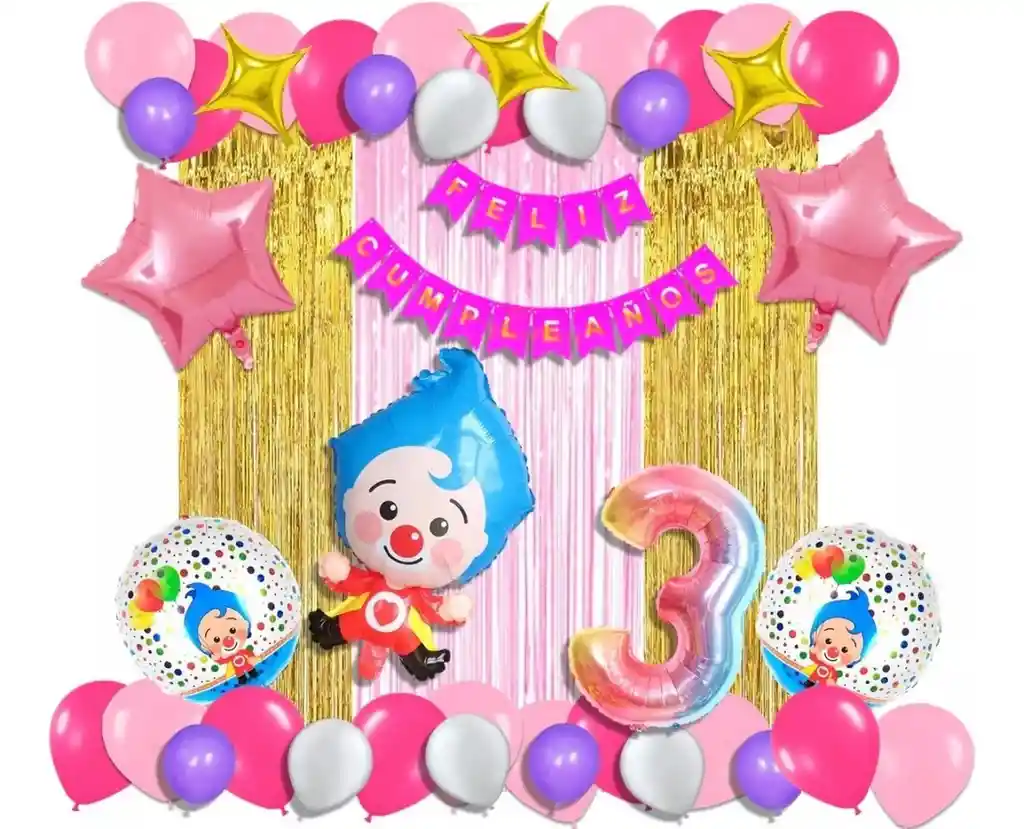 *********************GLOBOS Y PELUCHES MASMELO********************* Por tu compra te llevas. 2 Cortina oro rosa y dorada 1×2 metros 100 Globos surtidos: rosado, fucsia, morado ,blanco 30cm y 13cm R12 y R6 colores iguales a la foto suficientes para un arco orgánico de globos de 5 metros 2 Globo circular temática Payaso Plim 45x45cm 1 Globo Payaso Plim 65×45 cm 2 Globo estrella rosada 45x45cm 1 guirnalda feston Feliz cumpleaños 2 metros de largo 1 Globo Número tornasol segun tu elección del 1 al 9 altura 82 cm 7 metros de nylon para amarrar globos 1 Cinta de 100 Puntos Adhesivos *Los globos se entregan desinflados, tu compra no incluye el montaje ni la decoración, el servicio de armado no lo tenemos disponible. sin embargo te damos todas las instrucciones para hacer de modo profesional. Si deseas adicionar otros articulos a tu compra puedes escribirnos, recuerda que Somos Globos y Peluches Masmelo Si necesitas variación en los colores, colocar un número, más globos o realizar otros cambios en el diseño original escribenos para ver si podemos hacerlo. Tenemos todo lo necesario para tus decoraciones, somos lo último en tendencias mundiales decorativas. Tenemos disponible: Vasos, platos, manteles, guirnaldas, cubiertos, globos de todo tipo, números, letreros, vela, Etc. Puedes encontrar los articulos de nuestra tienda en el siguiente link, copia y pega, si no encuentas lo que necesitas escribenos: https://www.rappi.com.co/tiendas/900280040-globosypeluchesmasmelo-mt-enc/decoracion-para-fiestas/globos-y-bombas