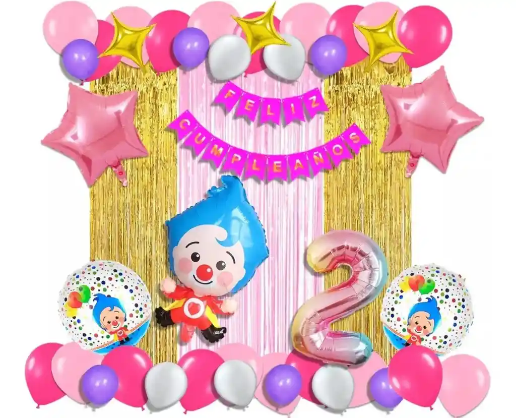 *********************GLOBOS Y PELUCHES MASMELO********************* Por tu compra te llevas. 2 Cortina oro rosa y dorada 1×2 metros 100 Globos surtidos: rosado, fucsia, morado ,blanco 30cm y 13cm R12 y R6 colores iguales a la foto suficientes para un arco orgánico de globos de 5 metros 2 Globo circular temática Payaso Plim 45x45cm 1 Globo Payaso Plim 65×45 cm 2 Globo estrella rosada 45x45cm 1 guirnalda feston Feliz cumpleaños 2 metros de largo 1 Globo Número tornasol segun tu elección del 1 al 9 altura 82 cm 7 metros de nylon para amarrar globos 1 Cinta de 100 Puntos Adhesivos *Los globos se entregan desinflados, tu compra no incluye el montaje ni la decoración, el servicio de armado no lo tenemos disponible. sin embargo te damos todas las instrucciones para hacer de modo profesional. Si deseas adicionar otros articulos a tu compra puedes escribirnos, recuerda que Somos Globos y Peluches Masmelo Si necesitas variación en los colores, colocar un número, más globos o realizar otros cambios en el diseño original escribenos para ver si podemos hacerlo. Tenemos todo lo necesario para tus decoraciones, somos lo último en tendencias mundiales decorativas. Tenemos disponible: Vasos, platos, manteles, guirnaldas, cubiertos, globos de todo tipo, números, letreros, vela, Etc. Puedes encontrar los articulos de nuestra tienda en el siguiente link, copia y pega, si no encuentas lo que necesitas escribenos: https://www.rappi.com.co/tiendas/900280040-globosypeluchesmasmelo-mt-enc/decoracion-para-fiestas/globos-y-bombas