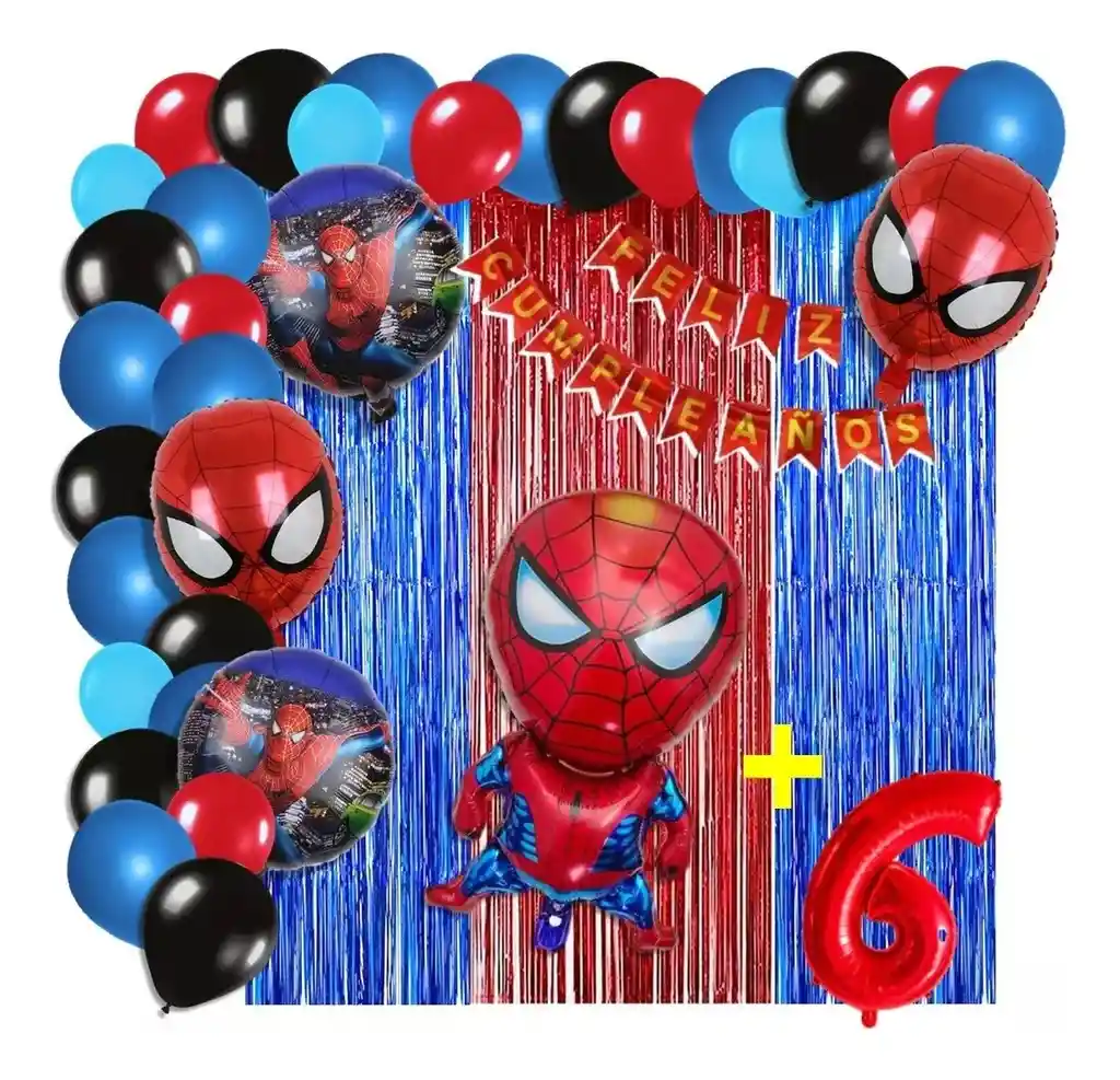 *********************GLOBOS Y PELUCHES MASMELO********************* Por tu compra te llevas. 2 Cortina rojo azul 1×2 metros 100 Globos surtidos:negro, azul rey, azul pastel, rojo 30cm y 13cm R12 y R6 colores iguales a la foto suficientes para un arco orgánico de globos de 5 metros 2 Globo circular temática spiderman 45x45cm 1 Globo spiderman 65×45 cm 2 Globo cabeza Spiderman 45x45cm 1 guirnalda feston Feliz cumpleaños 2 metros de largo 1 Globo Número rojo segun tu elección del 1 al 9 altura 82 cm 7 metros de nylon para amarrar globos 1 Cinta de 100 Puntos Adhesivos *Los globos se entregan desinflados, tu compra no incluye el montaje ni la decoración, el servicio de armado no lo tenemos disponible. sin embargo te damos todas las instrucciones para hacer de modo profesional. Si deseas adicionar otros articulos a tu compra puedes escribirnos, recuerda que Somos Globos y Peluches Masmelo Si necesitas variación en los colores, colocar un número, más globos o realizar otros cambios en el diseño original escribenos para ver si podemos hacerlo. Tenemos todo lo necesario para tus decoraciones, somos lo último en tendencias mundiales decorativas. Tenemos disponible: Vasos, platos, manteles, guirnaldas, cubiertos, globos de todo tipo, números, letreros, vela, Etc. Puedes encontrar los articulos de nuestra tienda en el siguiente link, copia y pega, si no encuentas lo que necesitas escribenos: https://www.rappi.com.co/tiendas/900280040-globosypeluchesmasmelo-mt-enc/decoracion-para-fiestas/globos-y-bombas
