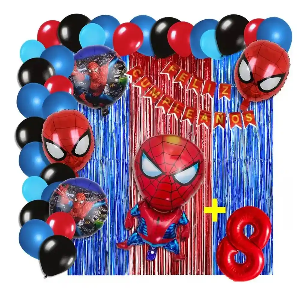 *********************GLOBOS Y PELUCHES MASMELO********************* Por tu compra te llevas. 2 Cortina rojo azul 1×2 metros 100 Globos surtidos:negro, azul rey, azul pastel, rojo 30cm y 13cm R12 y R6 colores iguales a la foto suficientes para un arco orgánico de globos de 5 metros 2 Globo circular temática spiderman 45x45cm 1 Globo spiderman 65×45 cm 2 Globo cabeza Spiderman 45x45cm 1 guirnalda feston Feliz cumpleaños 2 metros de largo 1 Globo Número rojo segun tu elección del 1 al 9 altura 82 cm 7 metros de nylon para amarrar globos 1 Cinta de 100 Puntos Adhesivos *Los globos se entregan desinflados, tu compra no incluye el montaje ni la decoración, el servicio de armado no lo tenemos disponible. sin embargo te damos todas las instrucciones para hacer de modo profesional. Si deseas adicionar otros articulos a tu compra puedes escribirnos, recuerda que Somos Globos y Peluches Masmelo Si necesitas variación en los colores, colocar un número, más globos o realizar otros cambios en el diseño original escribenos para ver si podemos hacerlo. Tenemos todo lo necesario para tus decoraciones, somos lo último en tendencias mundiales decorativas. Tenemos disponible: Vasos, platos, manteles, guirnaldas, cubiertos, globos de todo tipo, números, letreros, vela, Etc. Puedes encontrar los articulos de nuestra tienda en el siguiente link, copia y pega, si no encuentas lo que necesitas escribenos: https://www.rappi.com.co/tiendas/900280040-globosypeluchesmasmelo-mt-enc/decoracion-para-fiestas/globos-y-bombas