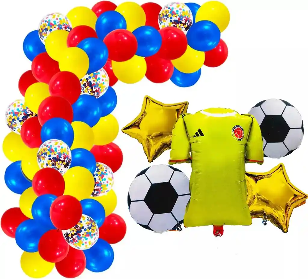******GLOBOS Y PELUCHES MASMELO***** Somos Mercado Lider Platinum Distribuidores autorizados de Sempertex Te damos toda la asesoria para que tú puedas armar tu propio arco Por tu compra te llevas: 6 Globo transparente con confeti tricolor 30cm 25 Globo rojo 30cm 30 Globo amarillo 30cm 30 Globo azul 30 cm 1 Cinta de arco 5 metros 1 Cinta de 100 puntos adhesivos 1 Globo camisa Colombia 65x45cm 2 Globo estrella dorada 45x45cm 2 Globo circular balón 45x45cm *No incluye el montaje ni la decoración, el servicio de armado no lo tenemos disponible. sin embargo te damos todas las instrucciones para hacer de modo profesional. Si deseas adicionar otros articulos a tu compra puedes escribirnos, recuerda que Somos Globos y Peluches Masmelo Si necesitas variación en los colores, colocar un número, más Globos o realizar otros cambios en el diseño original escribenos para ver si podemos hacerlo. Tenemos todo lo necesario para tus decoraciones, somos lo último en tendencias mundiales decorativas. Tenemos disponible: Vasos, platos, manteles, guirnaldas, cubiertos, Globos de todo tipo, números, letreros, vela, Etc. Puedes encontrar los articulos de nuestra tienda en el siguiente link, copia y pega, si no encuentas lo que necesitas escribenos: