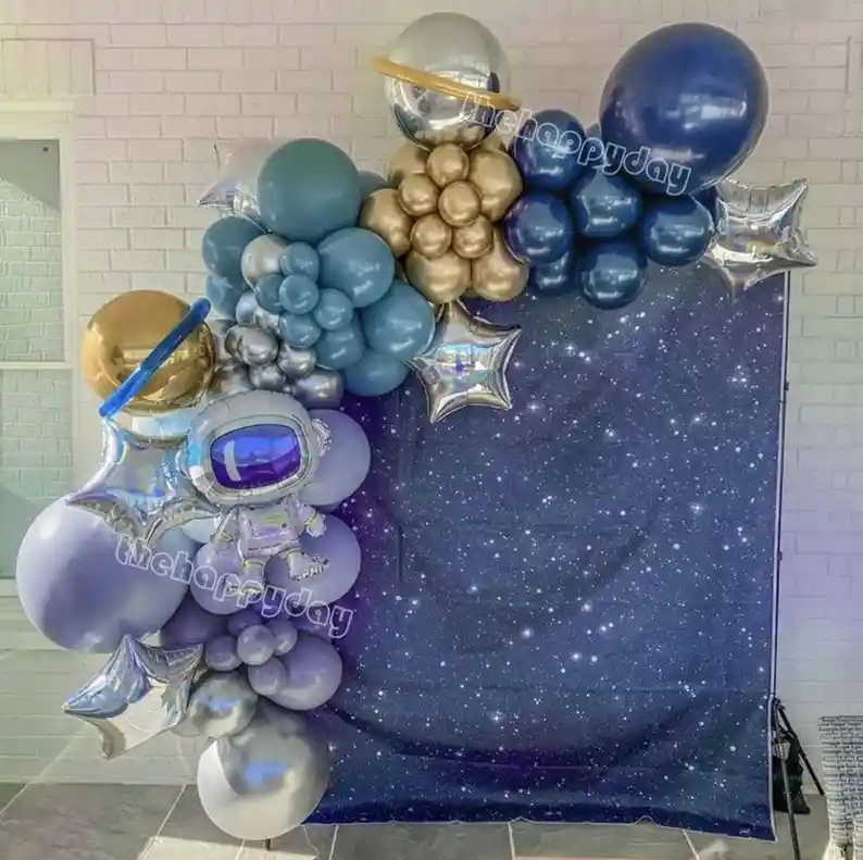 *********************GLOBOS Y PELUCHES MASMELO********************* Por tu compra te llevas: 5 Globo estrella plateado 45 x 45 cm 1 Globo astronauta 65x35 cm 2 Mil figuras azul 2 Mil figuras dorado 1 Globo azul naval 45 cm 2 Globo plateado cromado 45 cm 1 Globo morado pastel 45 cm 1 Globo cromado dorado 45 cm 15 Globo azul naval 30 cm 10 Globo dorado cromado 30 cm 10 Globo dorado cromado 13 cm 15 Globo verde esmeralda 30 cm 10 Globo plateado cromado 30 cm 10 Globo plateado cromado 13 cm 20 Globo morado pastel 30 cm 10 Globo morado pastel 13 cm 1 Cinta para hacer arcos 1 Cinta de 100 puntos adhesivos *Los globos se entregan desinflados, tu compra no incluye el montaje ni la decoración, el servicio de armado no lo tenemos disponible. sin embargo te damos todas las instrucciones para hacer de modo profesional. Si deseas adicionar otros artículos a tu compra puedes escribirnos, recuerda que Somos Globos y Peluches Masmelo Si necesitas variación en los colores, colocar un número, más globos o realizar otros cambios en el diseño original escríbenos para ver si podemos hacerlo. Tenemos todo lo necesario para tus decoraciones, somos lo último en tendencias mundiales decorativas. Tenemos disponible: Vasos, platos, manteles, guirnaldas, cubiertos, globos de todo tipo, números, letreros, vela, Etc. Puedes encontrar los artículos de nuestra tienda en el siguiente link, copia y pega, si no encuentras lo que necesitas escríbenos: https://www.rappi.com.co/tiendas/900280040-globosypeluchesmasmelo-mt-enc/decoracion-para-fiestas/globos-y-bombas