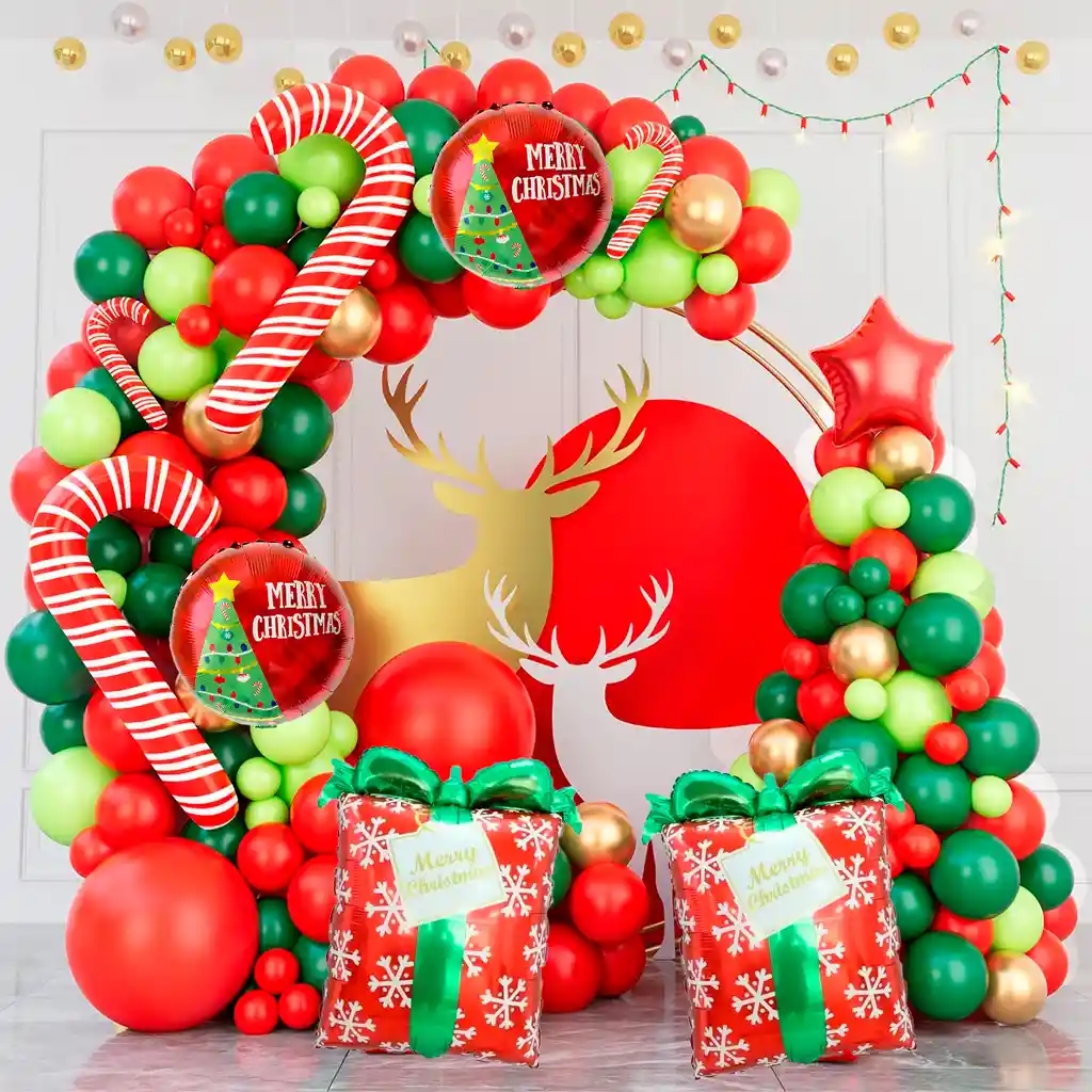 *********************GLOBOS Y PELUCHES MASMELO********************* ————————-Somos Mercado Líder Platinum———————— Te damos toda la asesoría para que tú puedas armar tu propio arco Por tu compra te llevas: 2 Globo rojo 45cm 2 Globo regalo 65x45cm 1 Globo estrella roja 45x45cm 2 Globo circular navidad 45cm 2 Globo bastón navidad 70x30 cm 2 Globo bastón navidad 45x20cm 15 Globo verde lima 30 cm 10 Globo verde lima 13 cm 25 Globo verde selva 30 cm 15 Globo verde selva 13 cm 30 Globo rojo 30 cm 15 Globo rojo 13 cm 10 Globo dorado cromado 13 cm Accesorios: 1 Cinta de arco 5 metros 1 Pegatina 100 puntos adhesivos *No incluye fondo decorativo no está disponible. * Los globos se entregan desinflados, tu compra no incluye el montaje ni la decoración, el servicio de armado no lo tenemos disponible. sin embargo te damos todas las instrucciones para hacer de modo profesional. Si deseas adicionar otros artículos a tu compra puedes escribirnos, recuerda que Somos Globos y Peluches Masmelo Si necesitas variación en los colores, colocar un número, más globos o realizar otros cambios en el diseño original escríbenos para ver si podemos hacerlo. Tenemos todo lo necesario para tus decoraciones, somos lo último en tendencias mundiales decorativas. Tenemos disponible: Vasos, platos, manteles, guirnaldas, cubiertos, globos de todo tipo, números, letreros, vela, Etc. Puedes encontrar los artículos de nuestra tienda en el siguiente link, copia y pega, si no encuentras lo que necesitas escríbenos: https://www.rappi.com.co/tiendas/900280040-globosypeluchesmasmelo-mt-enc/decoracion-para-fiestas/globos-y-bombas