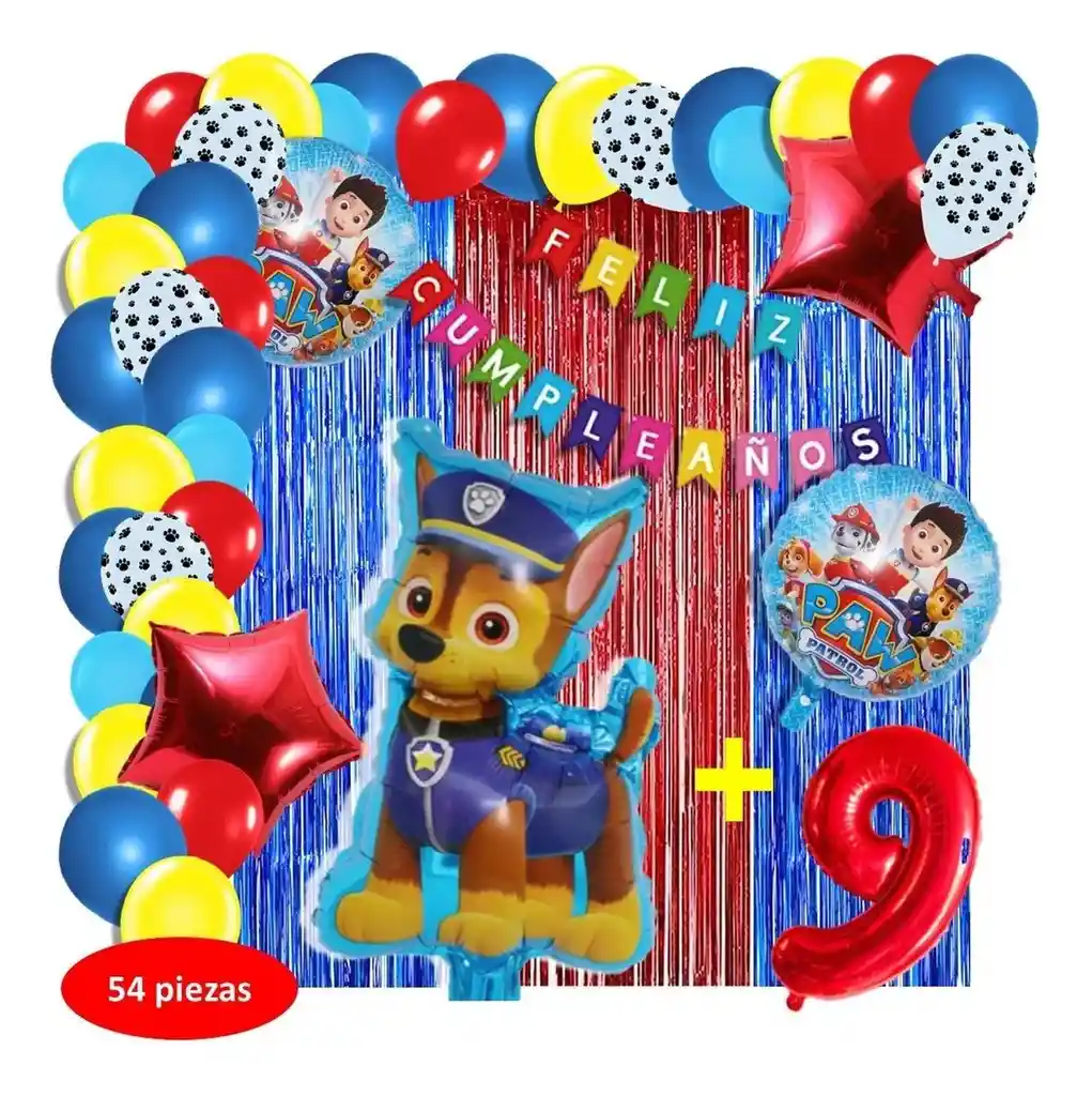 *********************GLOBOS Y PELUCHES MASMELO********************* Por tu compra te llevas. 2 Cortina azul rojo 1×2 metros 100 Globos surtidos: amarillo, rojo, azul, azul pastel, Blanco con manchitas de huellas 30cm y 13cm R12 y R6 colores iguales a la foto suficientes para un arco orgánico de globos de 5 metros 2 Globo circular temática patrulla canina 45x45cm 1 Globo Patrulla canina perro Chase 65×45 cm 2 Globo estrella roja 45x45cm 1 guirnalda feston Feliz cumpleaños 2 metros de largo 1 Globo Número rojo segun tu elección del 1 al 9 altura 82 cm 7 metros de nylon para amarrar globos 1 Cinta de 100 Puntos Adhesivos *Los globos se entregan desinflados, tu compra no incluye el montaje ni la decoración, el servicio de armado no lo tenemos disponible. sin embargo te damos todas las instrucciones para hacer de modo profesional. Si deseas adicionar otros articulos a tu compra puedes escribirnos, recuerda que Somos Globos y Peluches Masmelo Si necesitas variación en los colores, colocar un número, más globos o realizar otros cambios en el diseño original escribenos para ver si podemos hacerlo. Tenemos todo lo necesario para tus decoraciones, somos lo último en tendencias mundiales decorativas. Tenemos disponible: Vasos, platos, manteles, guirnaldas, cubiertos, globos de todo tipo, números, letreros, vela, Etc. Puedes encontrar los articulos de nuestra tienda en el siguiente link, copia y pega, si no encuentas lo que necesitas escribenos: https://www.rappi.com.co/tiendas/900280040-globosypeluchesmasmelo-mt-enc/decoracion-para-fiestas/globos-y-bombas