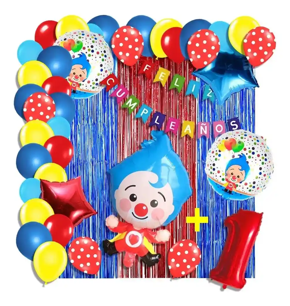 *********************GLOBOS Y PELUCHES MASMELO********************* Por tu compra te llevas. 2 Cortina rojo ya azul 1×2 metros 100 Globos surtidos: amarillo, azul, rojo, azul pastel 30cm y 13cm R12 y R6 colores iguales a la foto suficientes para un arco orgánico de globos de 5 metros 2 Globo circular temática Payaso Plim 45x45cm 1 Globo payaso plim 65×45 cm 2 Globo estrella azul 45x45cm 1 guirnalda feston Feliz cumpleaños 2 metros de largo 1 Globo Número rojo segun tu elección del 1 al 9 altura 82 cm 7 metros de nylon para amarrar globos 1 Cinta de 100 Puntos Adhesivos *Los globos se entregan desinflados, tu compra no incluye el montaje ni la decoración, el servicio de armado no lo tenemos disponible. sin embargo te damos todas las instrucciones para hacer de modo profesional. Si deseas adicionar otros articulos a tu compra puedes escribirnos, recuerda que Somos Globos y Peluches Masmelo Si necesitas variación en los colores, colocar un número, más globos o realizar otros cambios en el diseño original escribenos para ver si podemos hacerlo. Tenemos todo lo necesario para tus decoraciones, somos lo último en tendencias mundiales decorativas. Tenemos disponible: Vasos, platos, manteles, guirnaldas, cubiertos, globos de todo tipo, números, letreros, vela, Etc. Puedes encontrar los articulos de nuestra tienda en el siguiente link, copia y pega, si no encuentas lo que necesitas escribenos: https://www.rappi.com.co/tiendas/900280040-globosypeluchesmasmelo-mt-enc/decoracion-para-fiestas/globos-y-bombas