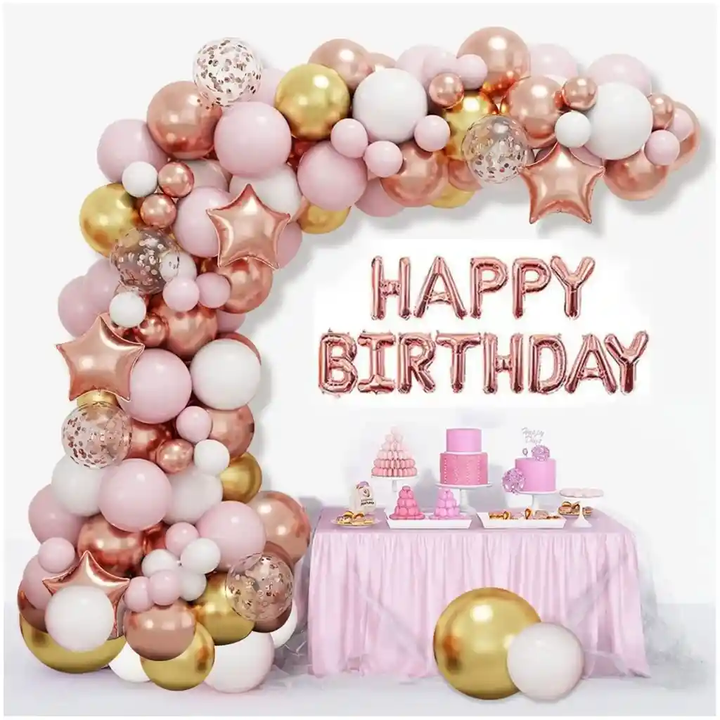 *********************GLOBOS Y PELUCHES MASMELO********************* Te damos toda la asesoria para que tú puedas armar tu propio arco Por tu compra te llevas: 1 Globo letrero Happy birthdat oro rosa 40cm altura 30 Globo oro rosa cromado 30cm 30 Globo rosado pastel 30cm 15 Globo blanco mate 30cm 15 Globo dorado cromado 30cm 4 Globo estrella metalizado 45x45cm 6 Globo transparente con confetti oro rosa 30cm 10 Globo oro rosa cromado 13cm 10 Globo pastel rosado 13cm 10 Globo cromado dorado 13cm 10 Globo blanco mate 13cm 1 Cinta de arco 5 metros 1 pegatina 100 puntos adhesivos *Los globos se entregan desinflados, tu compra no incluye el montaje ni la decoración, el servicio de armado no lo tenemos disponible. sin embargo te damos todas las instrucciones para hacer de modo profesional. Si deseas adicionar otros articulos a tu compra puedes escribirnos, recuerda que Somos Globos y Peluches Masmelo ;) - En ciudades fuera de Bogotá despachamos para el mismo día si compras antes de las 11AM (no incluye festivos) - En Bogotá despachamos para el mismo día, si haces el pedido antes de las 4PM (no incluye festivos)