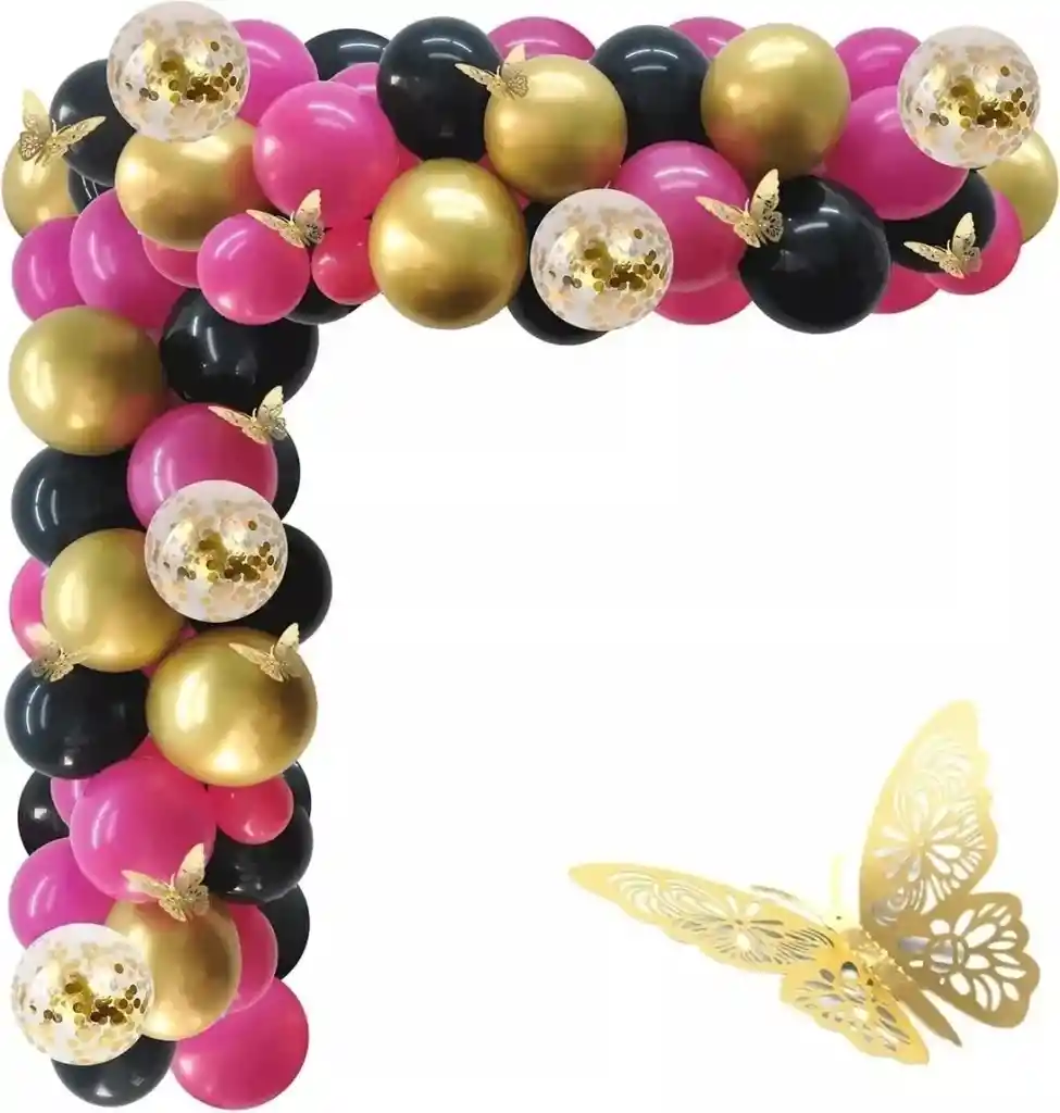 *********************GLOBOS Y PELUCHES MASMELO********************* Somos Mercado Lider Platinum Por tu compra te llevas: 5 Globo confeti transparente dorado 30cm 10 Globo dorado cromado 30cm 30 Globo fucsia 30cm 30 Globo negro 30cm 12 mariposas doradas 1 Cinta de arco 5 metros 1 Cinta de 100 puntos adhesivos