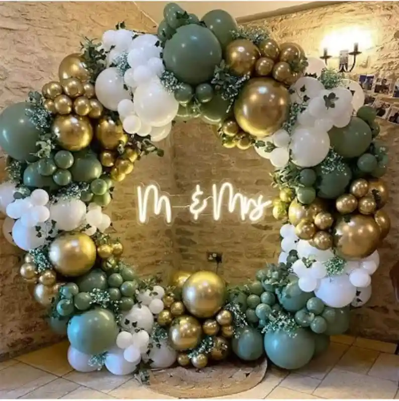 *********************GLOBOS Y PELUCHES MASMELO********************* --------------------------Somos Mercado Lider Platinum------------------------ Por tu compra te llevas. 35 Globo verde eucalipto 30 cm 30 Globo verde eucalipto 13 cm 35 Globo blanco 30 cm 30 Globo blanco 40 cm 25 Globo cromado dorado 30 cm 20 Globo cromado dorado 13 cm 8 metros de nylon 1 Cinta de 100 puntos adhesivos * No incluye estructura en circulo* El arco tiene un largo de 5 metros, el nylon adicional es para pegar en las paredes o puntos de apoyo. * No incluye hojas, No include mariposas, no incluye mobiliario, no incluye follaje ni rosas Los Globos se entregan desinflados, tu compra no incluye el montaje ni la decoración, el servicio de armado no lo tenemos disponible. sin embargo te damos todas las instrucciones para hacerlo de modo profesional. Si deseas adicionar otros articulos a tu compra puedes escribirnos, recuerda que Somos Globos y Peluches Masmelo ;) Si necesitas variación en los colores, colocar un número, más globos o realizar otros cambios en el diseño original escribenos para ver si podemos hacerlo. Tenemos todo lo necesario para tus decoraciones, somos lo último en tendencias mundiales decorativas. Tenemos disponible: Vasos, platos, manteles, guirnaldas, cubiertos, globos de todo tipo, números, letreros, vela, Etc. Puedes encontrar los articulos de nuestra tienda en el siguiente link, copia y pega, si no encuentas lo que necesitas escribenos: https://www.rappi.com.co/tiendas/900280040-globosypeluchesmasmelo-mt-enc/decoracion-para-fiestas/globos-y-bombas - En ciudades fuera de Bogotá despachamos para el mismo día si compras antes de las 11AM (no incluye festivos) - En Bogotá despachamos para el mismo día, si haces el pedido antes de las 4PM (no incluye festivos)