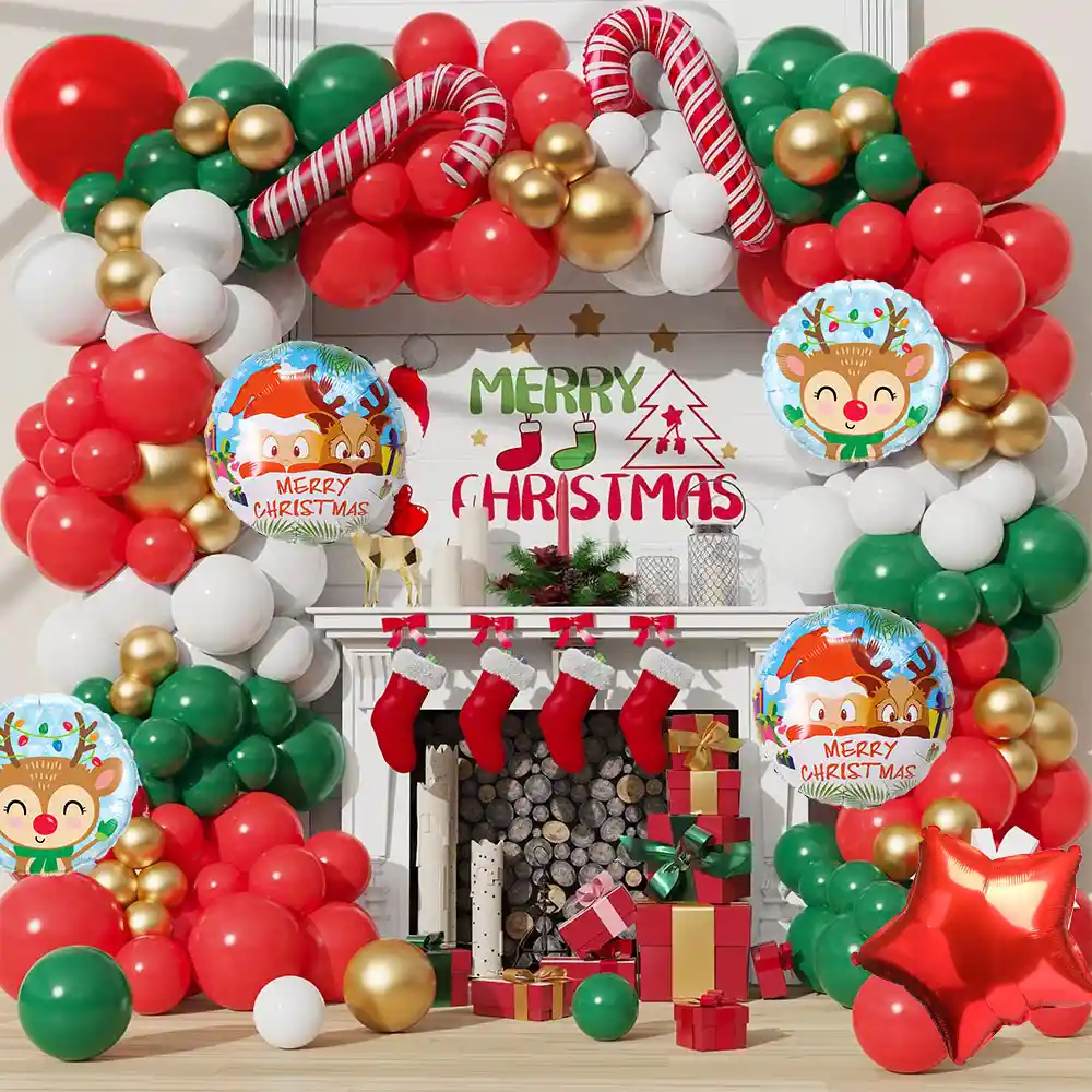 *********************GLOBOS Y PELUCHES MASMELO********************* ————————-Somos Mercado Líder Platinum———————— Te damos toda la asesoría para que tú puedas armar tu propio arco Por tu compra te llevas: 4 Globo circular de navidad 2 Globo Bastón navidad 70x35 cm 2 Globo rojo 45cm 1 Globo estrella rojo 45 cm 25 Globo dorado cromado 13 cm 25 Globo verde selva 30 cm 20 Globo verde selva 13 cm 25 Globo rojo 30 cm 15 Globo rojo 13 cm 20 Globo blanco 30 cm 10 Globo blanco 13 cm Accesorios: 1 Cinta de arco 5 metros 1 Pegatina 100 puntos adhesivos *No incluye fondo decorativo no está disponible. * Los globos se entregan desinflados, tu compra no incluye el montaje ni la decoración, el servicio de armado no lo tenemos disponible. sin embargo te damos todas las instrucciones para hacer de modo profesional. Si deseas adicionar otros artículos a tu compra puedes escribirnos, recuerda que Somos Globos y Peluches Masmelo Si necesitas variación en los colores, colocar un número, más globos o realizar otros cambios en el diseño original escríbenos para ver si podemos hacerlo. Tenemos todo lo necesario para tus decoraciones, somos lo último en tendencias mundiales decorativas. Tenemos disponible: Vasos, platos, manteles, guirnaldas, cubiertos, globos de todo tipo, números, letreros, vela, Etc. Puedes encontrar los artículos de nuestra tienda en el siguiente link, copia y pega, si no encuentras lo que necesitas escríbenos: https://www.rappi.com.co/tiendas/900280040-globosypeluchesmasmelo-mt-enc/decoracion-para-fiestas/globos-y-bombas