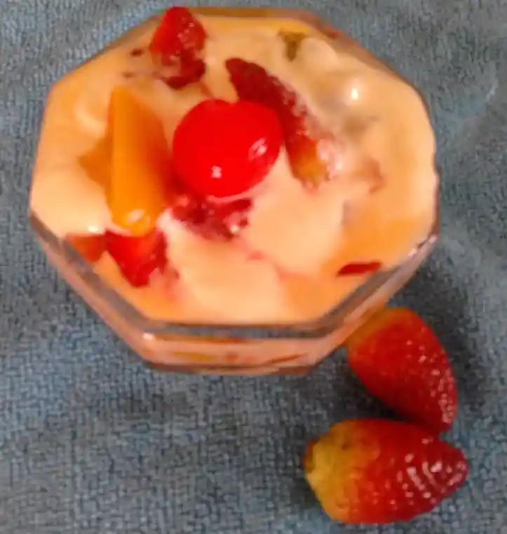 Delicioso postre frío con trocitos de fresa y melocotón, gelatina de fresa y naranja, bañados en Yogur de fresa o melocotón. Con un toque de leche condensada y crema de leche. Decorado con una cereza.