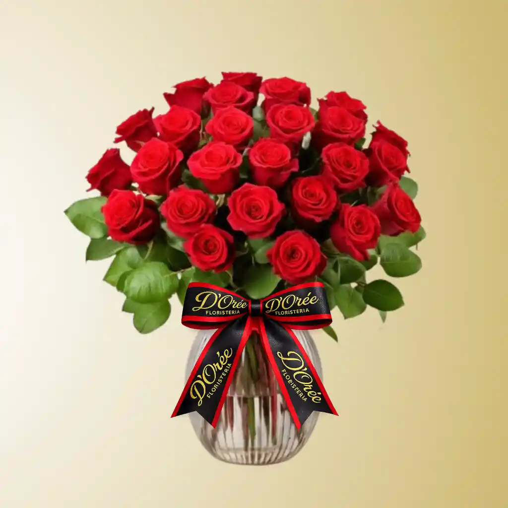 Hermoso Arreglo de Rosas compuesto por: - 30 Rosas Rojas decoradas - Lleva Follaje verde - Tiene como base una pecera mediana