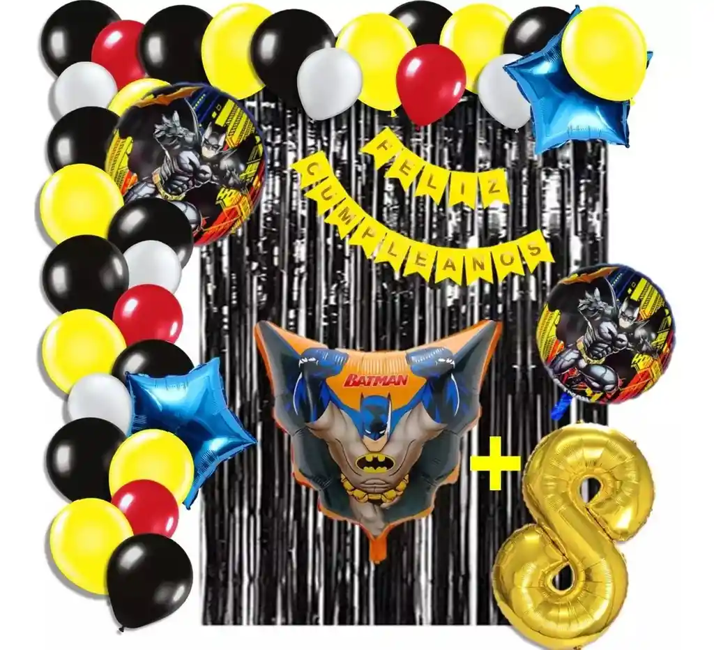 *********************GLOBOS Y PELUCHES MASMELO********************* Por tu compra te llevas. 2 Cortina negro 1×2 metros 100 Globos surtidos: negro, amarillo, plateado satinado, rojo 30cm y 13cm R12 y R6 colores iguales a la foto suficientes para un arco orgánico de globos de 5 metros 2 Globo circular temática Batman 45x45cm 1 Globo Batman 65×45 cm 2 Globo estrella azul 45x45cm 1 guirnalda feston Feliz cumpleaños 2 metros de largo 1 Globo Número dorado segun tu elección del 1 al 9 altura 82 cm 7 metros de nylon para amarrar globos 1 Cinta de 100 Puntos Adhesivos *Los globos se entregan desinflados, tu compra no incluye el montaje ni la decoración, el servicio de armado no lo tenemos disponible. sin embargo te damos todas las instrucciones para hacer de modo profesional. Si deseas adicionar otros articulos a tu compra puedes escribirnos, recuerda que Somos Globos y Peluches Masmelo Si necesitas variación en los colores, colocar un número, más globos o realizar otros cambios en el diseño original escribenos para ver si podemos hacerlo. Tenemos todo lo necesario para tus decoraciones, somos lo último en tendencias mundiales decorativas. Tenemos disponible: Vasos, platos, manteles, guirnaldas, cubiertos, globos de todo tipo, números, letreros, vela, Etc. Puedes encontrar los articulos de nuestra tienda en el siguiente link, copia y pega, si no encuentas lo que necesitas escribenos: https://www.rappi.com.co/tiendas/900280040-globosypeluchesmasmelo-mt-enc/decoracion-para-fiestas/globos-y-bombas