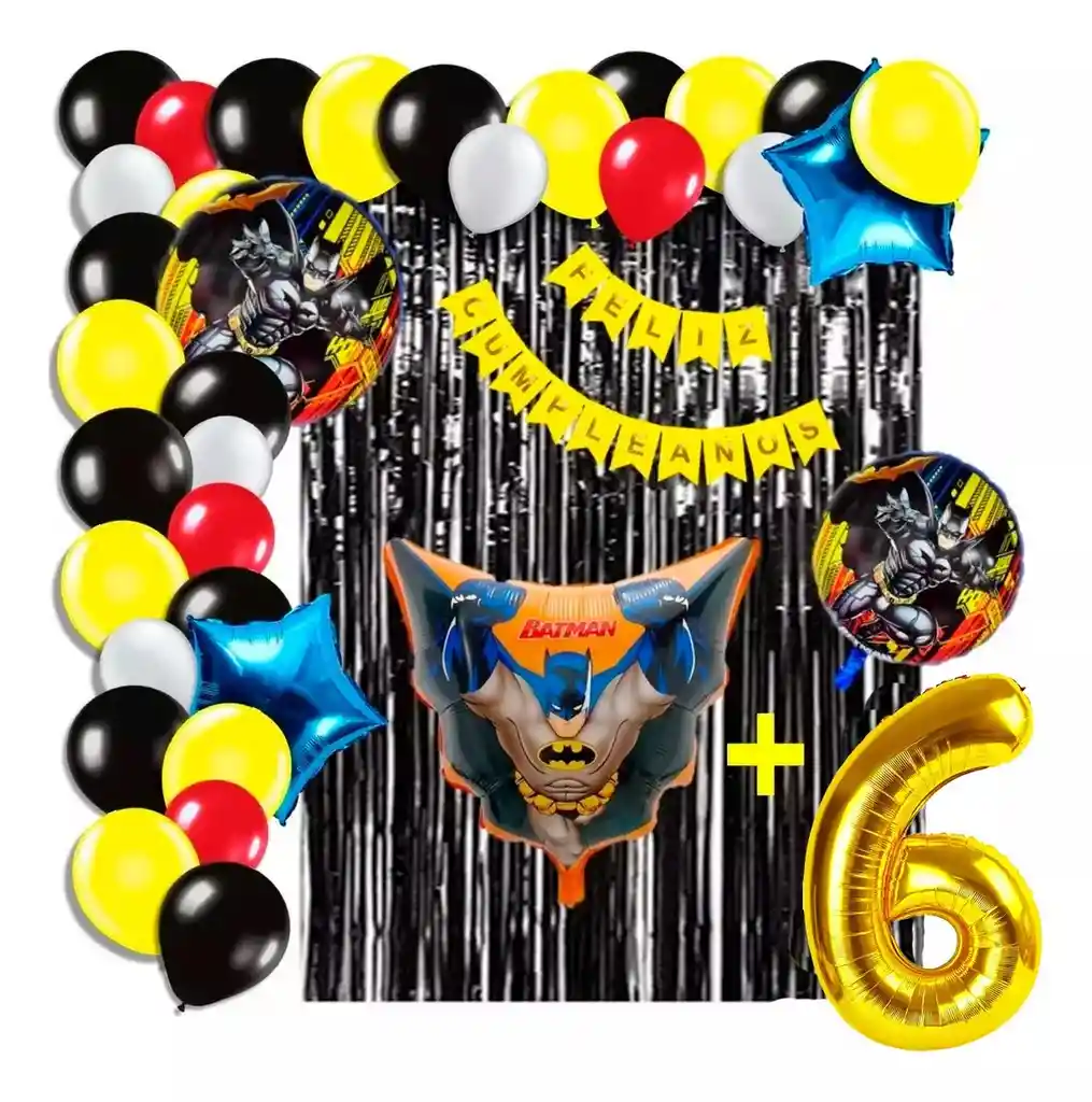*********************GLOBOS Y PELUCHES MASMELO********************* Por tu compra te llevas. 2 Cortina negro 1×2 metros 100 Globos surtidos: negro, amarillo, plateado satinado, rojo 30cm y 13cm R12 y R6 colores iguales a la foto suficientes para un arco orgánico de globos de 5 metros 2 Globo circular temática Batman 45x45cm 1 Globo Batman 65×45 cm 2 Globo estrella azul 45x45cm 1 guirnalda feston Feliz cumpleaños 2 metros de largo 1 Globo Número dorado segun tu elección del 1 al 9 altura 82 cm 7 metros de nylon para amarrar globos 1 Cinta de 100 Puntos Adhesivos *Los globos se entregan desinflados, tu compra no incluye el montaje ni la decoración, el servicio de armado no lo tenemos disponible. sin embargo te damos todas las instrucciones para hacer de modo profesional. Si deseas adicionar otros articulos a tu compra puedes escribirnos, recuerda que Somos Globos y Peluches Masmelo Si necesitas variación en los colores, colocar un número, más globos o realizar otros cambios en el diseño original escribenos para ver si podemos hacerlo. Tenemos todo lo necesario para tus decoraciones, somos lo último en tendencias mundiales decorativas. Tenemos disponible: Vasos, platos, manteles, guirnaldas, cubiertos, globos de todo tipo, números, letreros, vela, Etc. Puedes encontrar los articulos de nuestra tienda en el siguiente link, copia y pega, si no encuentas lo que necesitas escribenos: https://www.rappi.com.co/tiendas/900280040-globosypeluchesmasmelo-mt-enc/decoracion-para-fiestas/globos-y-bombas