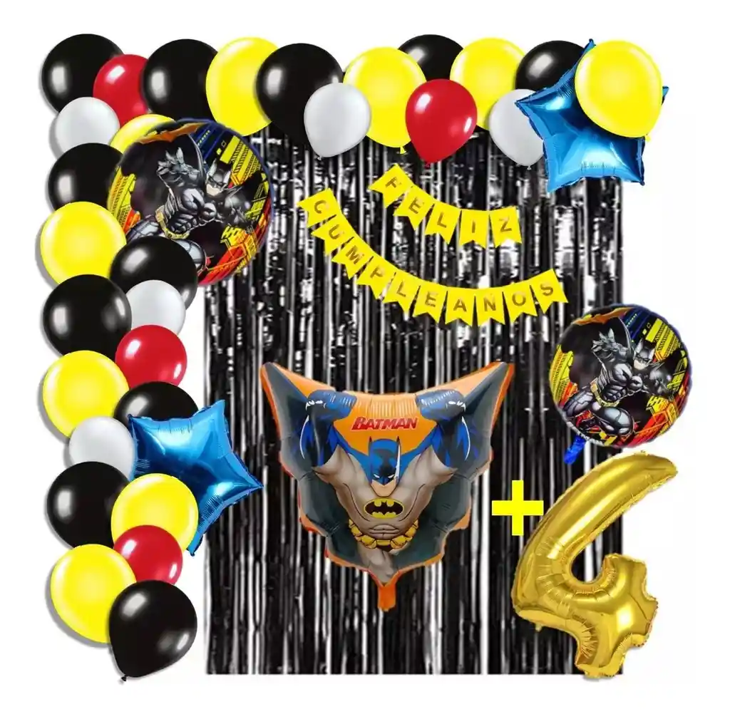 *********************GLOBOS Y PELUCHES MASMELO********************* Por tu compra te llevas. 2 Cortina negro 1×2 metros 100 Globos surtidos: negro, amarillo, plateado satinado, rojo 30cm y 13cm R12 y R6 colores iguales a la foto suficientes para un arco orgánico de globos de 5 metros 2 Globo circular temática Batman 45x45cm 1 Globo Batman 65×45 cm 2 Globo estrella azul 45x45cm 1 guirnalda feston Feliz cumpleaños 2 metros de largo 1 Globo Número dorado segun tu elección del 1 al 9 altura 82 cm 7 metros de nylon para amarrar globos 1 Cinta de 100 Puntos Adhesivos *Los globos se entregan desinflados, tu compra no incluye el montaje ni la decoración, el servicio de armado no lo tenemos disponible. sin embargo te damos todas las instrucciones para hacer de modo profesional. Si deseas adicionar otros articulos a tu compra puedes escribirnos, recuerda que Somos Globos y Peluches Masmelo Si necesitas variación en los colores, colocar un número, más globos o realizar otros cambios en el diseño original escribenos para ver si podemos hacerlo. Tenemos todo lo necesario para tus decoraciones, somos lo último en tendencias mundiales decorativas. Tenemos disponible: Vasos, platos, manteles, guirnaldas, cubiertos, globos de todo tipo, números, letreros, vela, Etc. Puedes encontrar los articulos de nuestra tienda en el siguiente link, copia y pega, si no encuentas lo que necesitas escribenos: https://www.rappi.com.co/tiendas/900280040-globosypeluchesmasmelo-mt-enc/decoracion-para-fiestas/globos-y-bombas