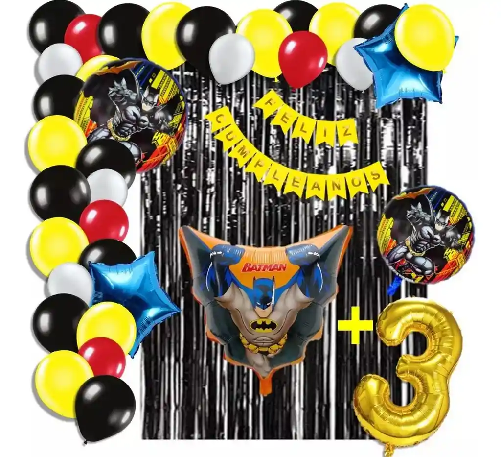 *********************GLOBOS Y PELUCHES MASMELO********************* Por tu compra te llevas. 2 Cortina negro 1×2 metros 100 Globos surtidos: negro, amarillo, plateado satinado, rojo 30cm y 13cm R12 y R6 colores iguales a la foto suficientes para un arco orgánico de globos de 5 metros 2 Globo circular temática Batman 45x45cm 1 Globo Batman 65×45 cm 2 Globo estrella azul 45x45cm 1 guirnalda feston Feliz cumpleaños 2 metros de largo 1 Globo Número dorado segun tu elección del 1 al 9 altura 82 cm 7 metros de nylon para amarrar globos 1 Cinta de 100 Puntos Adhesivos *Los globos se entregan desinflados, tu compra no incluye el montaje ni la decoración, el servicio de armado no lo tenemos disponible. sin embargo te damos todas las instrucciones para hacer de modo profesional. Si deseas adicionar otros articulos a tu compra puedes escribirnos, recuerda que Somos Globos y Peluches Masmelo Si necesitas variación en los colores, colocar un número, más globos o realizar otros cambios en el diseño original escribenos para ver si podemos hacerlo. Tenemos todo lo necesario para tus decoraciones, somos lo último en tendencias mundiales decorativas. Tenemos disponible: Vasos, platos, manteles, guirnaldas, cubiertos, globos de todo tipo, números, letreros, vela, Etc. Puedes encontrar los articulos de nuestra tienda en el siguiente link, copia y pega, si no encuentas lo que necesitas escribenos: https://www.rappi.com.co/tiendas/900280040-globosypeluchesmasmelo-mt-enc/decoracion-para-fiestas/globos-y-bombas
