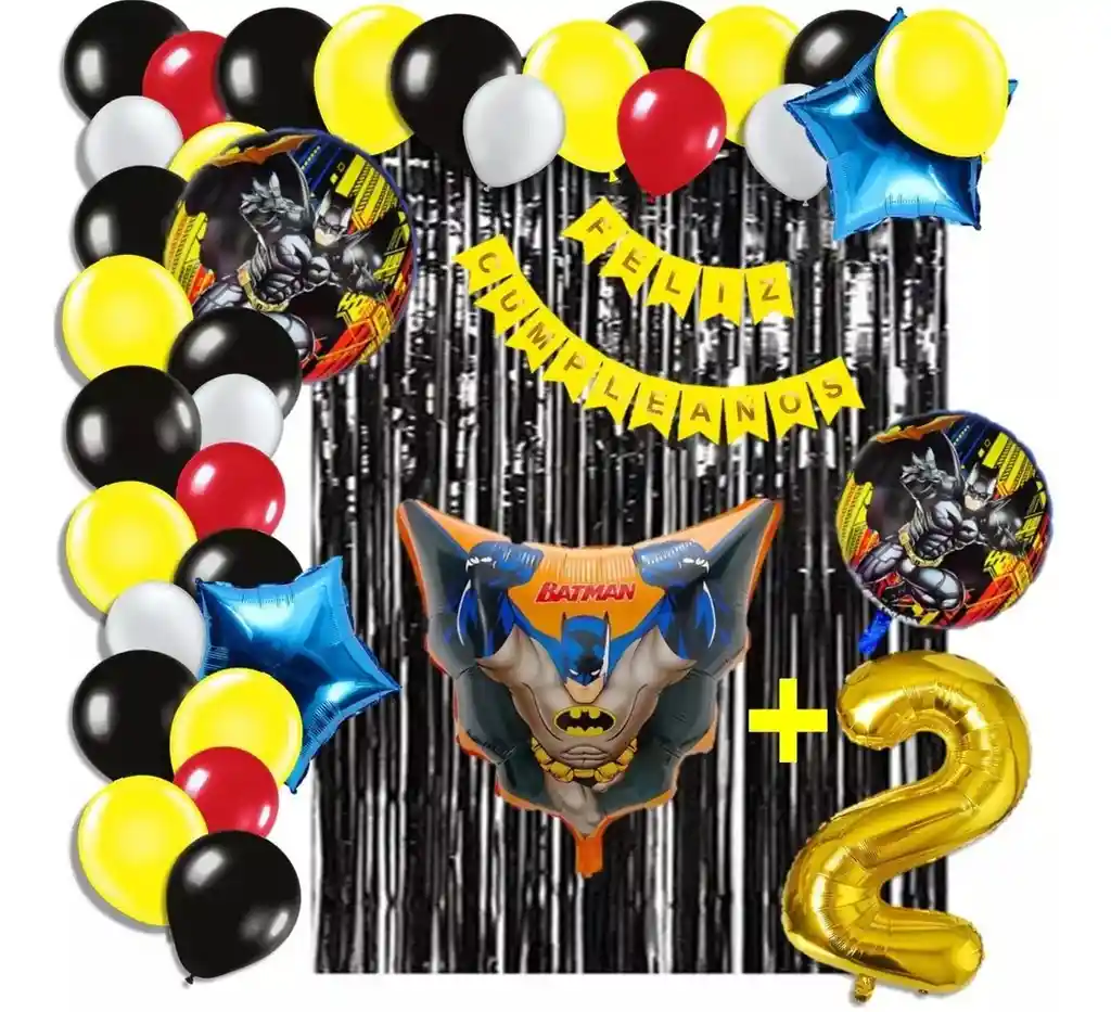 *********************GLOBOS Y PELUCHES MASMELO********************* Por tu compra te llevas. 2 Cortina negro 1×2 metros 100 Globos surtidos: negro, amarillo, plateado satinado, rojo 30cm y 13cm R12 y R6 colores iguales a la foto suficientes para un arco orgánico de globos de 5 metros 2 Globo circular temática Batman 45x45cm 1 Globo Batman 65×45 cm 2 Globo estrella azul 45x45cm 1 guirnalda feston Feliz cumpleaños 2 metros de largo 1 Globo Número dorado segun tu elección del 1 al 9 altura 82 cm 7 metros de nylon para amarrar globos 1 Cinta de 100 Puntos Adhesivos *Los globos se entregan desinflados, tu compra no incluye el montaje ni la decoración, el servicio de armado no lo tenemos disponible. sin embargo te damos todas las instrucciones para hacer de modo profesional. Si deseas adicionar otros articulos a tu compra puedes escribirnos, recuerda que Somos Globos y Peluches Masmelo Si necesitas variación en los colores, colocar un número, más globos o realizar otros cambios en el diseño original escribenos para ver si podemos hacerlo. Tenemos todo lo necesario para tus decoraciones, somos lo último en tendencias mundiales decorativas. Tenemos disponible: Vasos, platos, manteles, guirnaldas, cubiertos, globos de todo tipo, números, letreros, vela, Etc. Puedes encontrar los articulos de nuestra tienda en el siguiente link, copia y pega, si no encuentas lo que necesitas escribenos: https://www.rappi.com.co/tiendas/900280040-globosypeluchesmasmelo-mt-enc/decoracion-para-fiestas/globos-y-bombas
