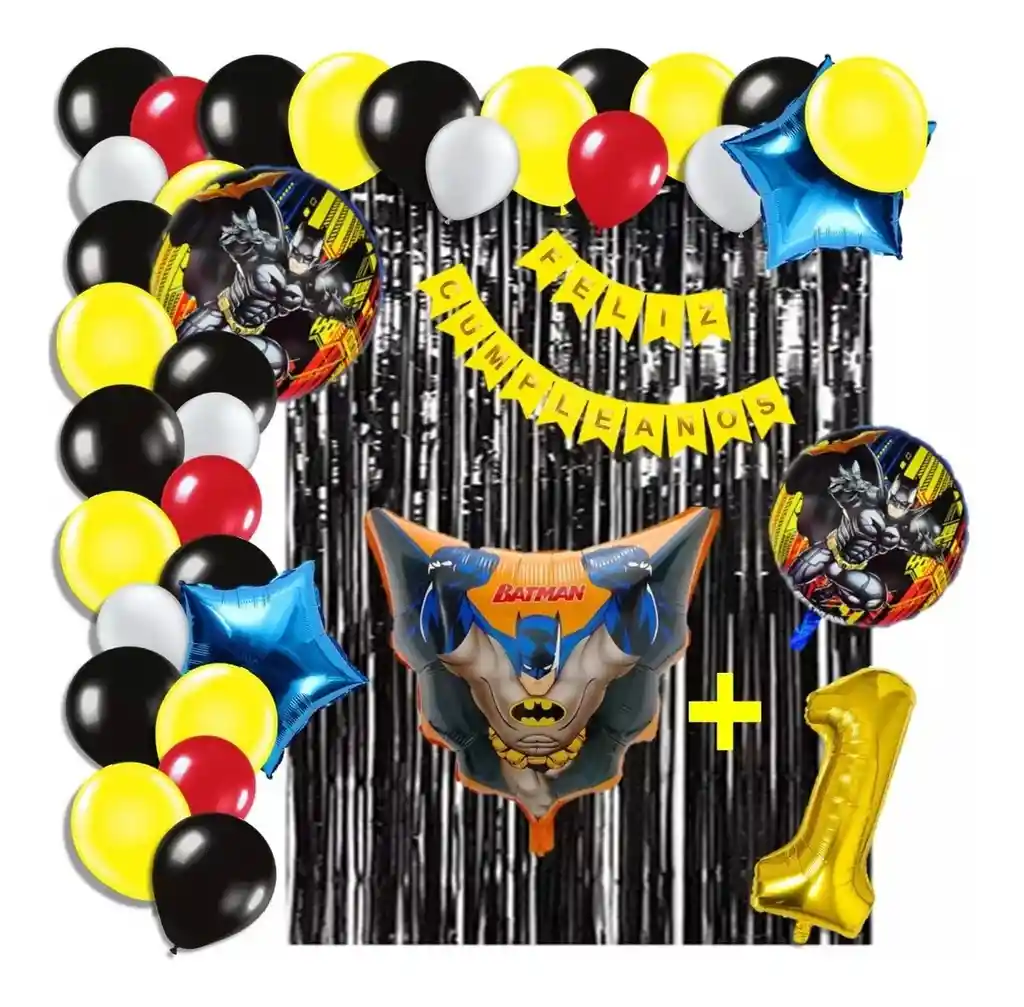 *********************GLOBOS Y PELUCHES MASMELO********************* Por tu compra te llevas. 2 Cortina negro 1×2 metros 100 Globos surtidos: negro, amarillo, plateado satinado, rojo 30cm y 13cm R12 y R6 colores iguales a la foto suficientes para un arco orgánico de globos de 5 metros 2 Globo circular temática Batman 45x45cm 1 Globo Batman 65×45 cm 2 Globo estrella azul 45x45cm 1 guirnalda feston Feliz cumpleaños 2 metros de largo 1 Globo Número dorado segun tu elección del 1 al 9 altura 82 cm 7 metros de nylon para amarrar globos 1 Cinta de 100 Puntos Adhesivos *Los globos se entregan desinflados, tu compra no incluye el montaje ni la decoración, el servicio de armado no lo tenemos disponible. sin embargo te damos todas las instrucciones para hacer de modo profesional. Si deseas adicionar otros articulos a tu compra puedes escribirnos, recuerda que Somos Globos y Peluches Masmelo Si necesitas variación en los colores, colocar un número, más globos o realizar otros cambios en el diseño original escribenos para ver si podemos hacerlo. Tenemos todo lo necesario para tus decoraciones, somos lo último en tendencias mundiales decorativas. Tenemos disponible: Vasos, platos, manteles, guirnaldas, cubiertos, globos de todo tipo, números, letreros, vela, Etc. Puedes encontrar los articulos de nuestra tienda en el siguiente link, copia y pega, si no encuentas lo que necesitas escribenos: https://www.rappi.com.co/tiendas/900280040-globosypeluchesmasmelo-mt-enc/decoracion-para-fiestas/globos-y-bombas