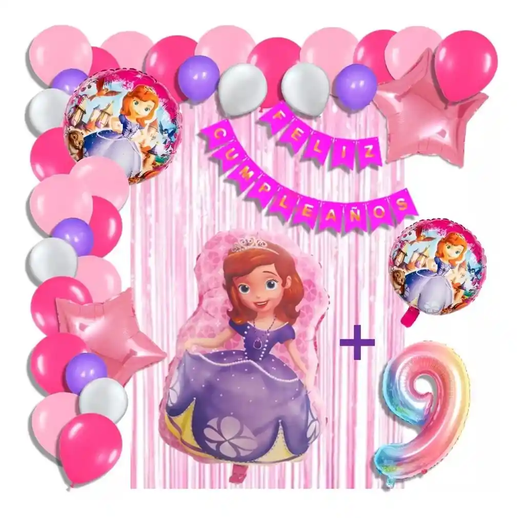 *********************GLOBOS Y PELUCHES MASMELO********************* Por tu compra te llevas. 2 Cortina oro rosa 1×2 metros 100 Globos surtidos: rosado, fucsia, morado blanco 30cm y 13cm R12 y R6 colores iguales a la foto suficientes para un arco orgánico de globos de 5 metros 2 Globo circular temática Sofia 45x45cm 1 Globo Princesa Sofia 65×45 cm 2 Globo estrella rosado 45x45cm 1 guirnalda feston Feliz cumpleaños 2 metros de largo 1 Globo Número tornasol segun tu elección del 1 al 9 altura 82 cm 7 metros de nylon para amarrar globos 1 Cinta de 100 Puntos Adhesivos *Los globos se entregan desinflados, tu compra no incluye el montaje ni la decoración, el servicio de armado no lo tenemos disponible. sin embargo te damos todas las instrucciones para hacer de modo profesional. Si deseas adicionar otros articulos a tu compra puedes escribirnos, recuerda que Somos Globos y Peluches Masmelo Si necesitas variación en los colores, colocar un número, más globos o realizar otros cambios en el diseño original escribenos para ver si podemos hacerlo. Tenemos todo lo necesario para tus decoraciones, somos lo último en tendencias mundiales decorativas. Tenemos disponible: Vasos, platos, manteles, guirnaldas, cubiertos, globos de todo tipo, números, letreros, vela, Etc. Puedes encontrar los articulos de nuestra tienda en el siguiente link, copia y pega, si no encuentas lo que necesitas escribenos: https://www.rappi.com.co/tiendas/900280040-globosypeluchesmasmelo-mt-enc/decoracion-para-fiestas/globos-y-bombas