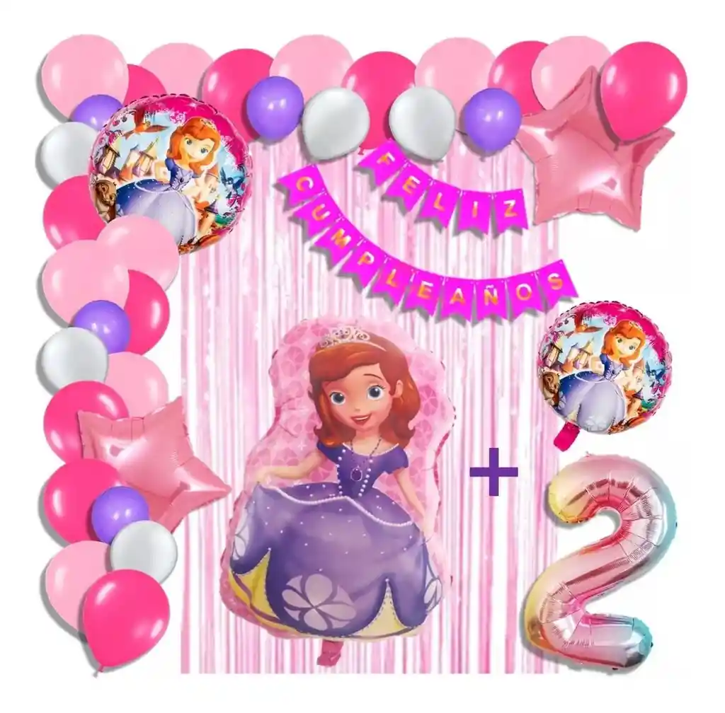 *********************GLOBOS Y PELUCHES MASMELO********************* Por tu compra te llevas. 2 Cortina oro rosa 1×2 metros 100 Globos surtidos: rosado, fucsia, morado blanco 30cm y 13cm R12 y R6 colores iguales a la foto suficientes para un arco orgánico de globos de 5 metros 2 Globo circular temática Sofia 45x45cm 1 Globo Princesa Sofia 65×45 cm 2 Globo estrella rosado 45x45cm 1 guirnalda feston Feliz cumpleaños 2 metros de largo 1 Globo Número tornasol segun tu elección del 1 al 9 altura 82 cm 7 metros de nylon para amarrar globos 1 Cinta de 100 Puntos Adhesivos *Los globos se entregan desinflados, tu compra no incluye el montaje ni la decoración, el servicio de armado no lo tenemos disponible. sin embargo te damos todas las instrucciones para hacer de modo profesional. Si deseas adicionar otros articulos a tu compra puedes escribirnos, recuerda que Somos Globos y Peluches Masmelo Si necesitas variación en los colores, colocar un número, más globos o realizar otros cambios en el diseño original escribenos para ver si podemos hacerlo. Tenemos todo lo necesario para tus decoraciones, somos lo último en tendencias mundiales decorativas. Tenemos disponible: Vasos, platos, manteles, guirnaldas, cubiertos, globos de todo tipo, números, letreros, vela, Etc. Puedes encontrar los articulos de nuestra tienda en el siguiente link, copia y pega, si no encuentas lo que necesitas escribenos: https://www.rappi.com.co/tiendas/900280040-globosypeluchesmasmelo-mt-enc/decoracion-para-fiestas/globos-y-bombas
