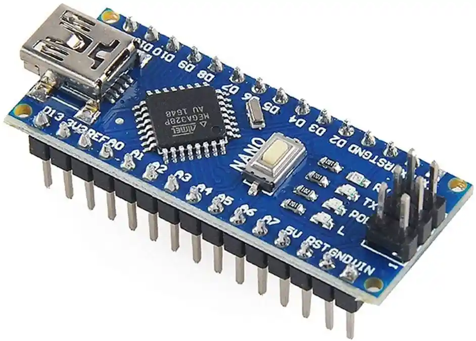 El Arduino Nano es una pequeña y completa placa basada en el ATmega328 (Arduino Nano 3.0) o el ATmega168 en sus versiones anteriores (Arduino Nano 2.x) que se usa conectándola a una protoboard. Tiene más o menos la misma funcionalidad que el Arduino Duemilanove, pero con una presentación diferente. No posee conector para alimentación externa, y funciona con un cable USB Mini-B.