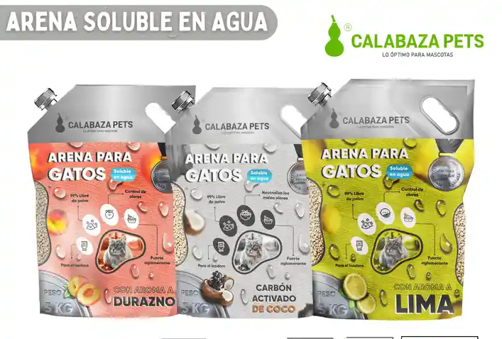 Arena soluble en agua que puedes desechar en el inodoro una vez usada. Es 99% libre de polvo, aglomerante y neutraliza los malos olores. Fragancia