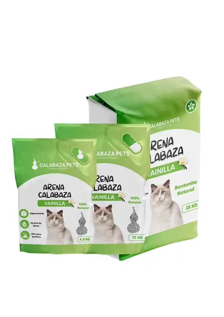 Arena sanitaria con olor a Vainilla, biodegradable, hecha con bentonita 100% natural. Ideal para absorber malos olores y mantener el ambiente limpio y fresco.